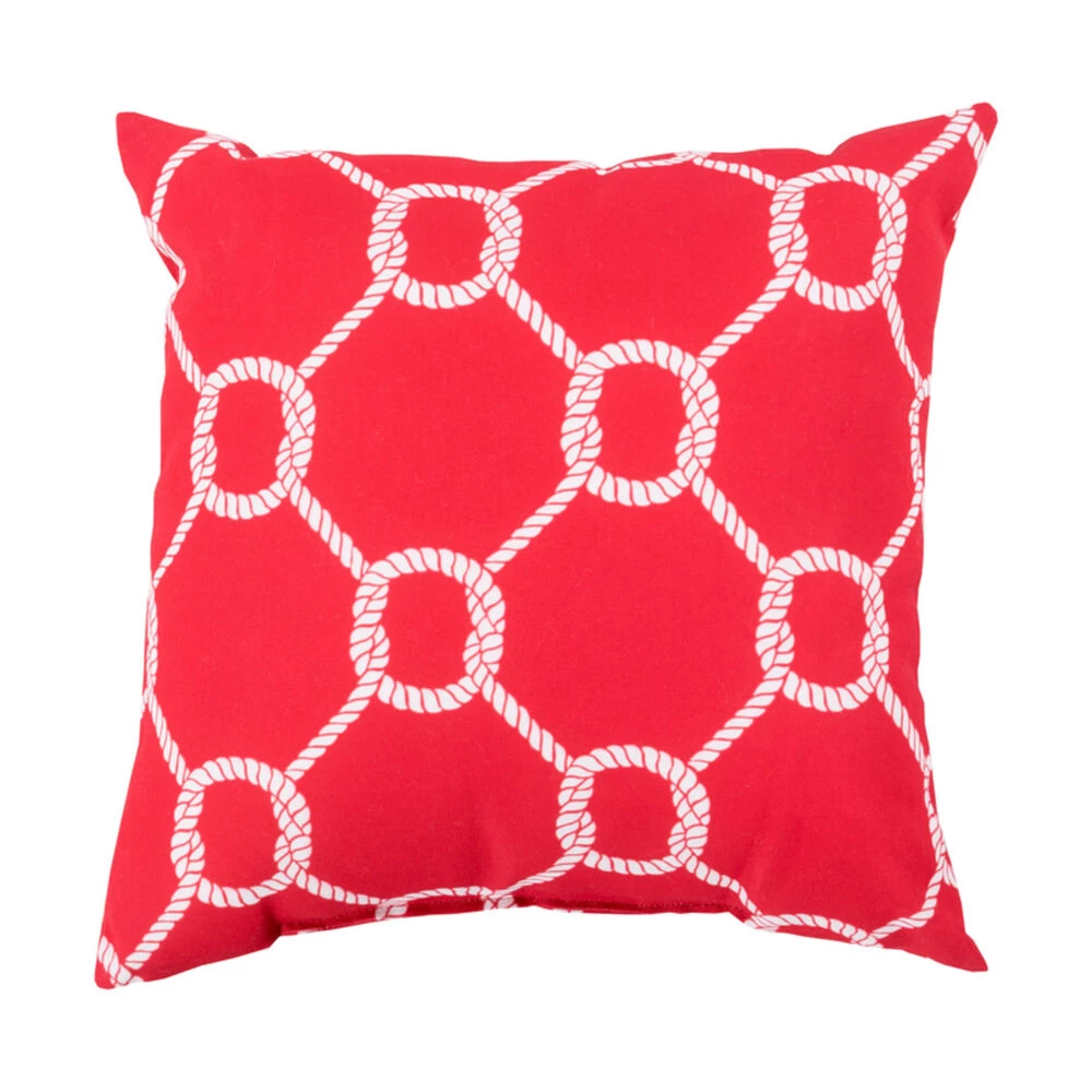 Get roped in by the nautical feel of this polished pillow! Featuring an intricate, intersecting rope design in cool white against a radiant red backdrop, this is the perfect piece to create a finished look in any room. This pillow contains a Virgin Poly Styrene Bead fill providing a reliable and affordable solution to updating your indoor or outdoor decor.