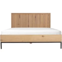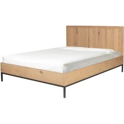 Bring the scandinavian vibes to your space with the Montego Bed. The beautifully crafted Headboard is made from solid Oak wood, showing off the natural knots and unique grain patterns. In addition, the slim metal legs add an airiness to the bedroom, making it industrial yet contemporary.