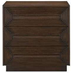 Notable for its extraordinary functionality and cool design, the Morombe Chest is nothing short of artistry in wood. A deep-toned distressed cocoa finish highlights the skillfully carved patterns of natural wood that form embedded squares in a stylish geometric illusion of depth. Each of the three drawers on this chest has soft-close drawer glides and solid mahogany dovetail drawer boxes.