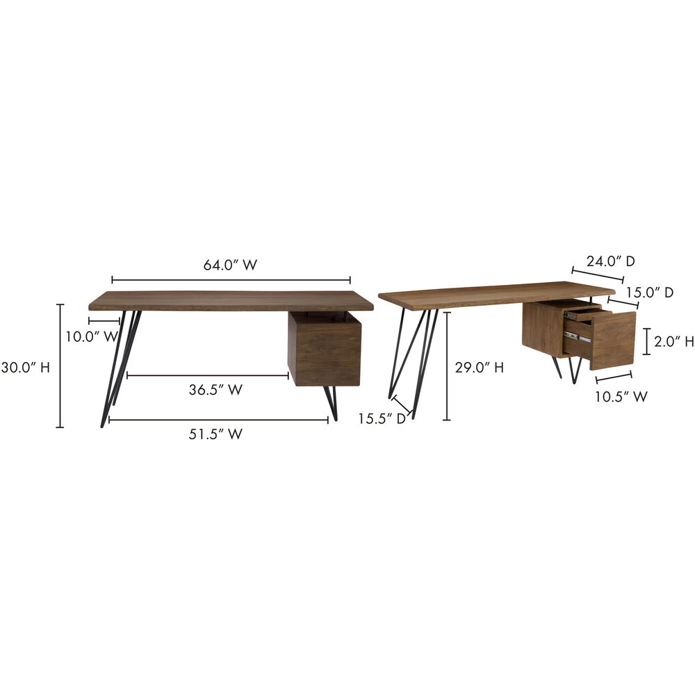 - Knee Space Depth: 27 / Knee Space Height: 29 / Knee Space Width: 36.75Solid acacia wood top with a sleek iron hairpin leg designA single cabinet with side-mounted drawer glides with open storage shelf aboveFile folder cabinet fits legal-size filesSome assembly requiredWipe wooden furniture down regularly with a clean, dry cloth to remove dust. Use warm water and a mild soap to clean wooden furniture. Place your wooden furniture away from prolonged direct sunlight as this can result in spotting, a phenomenon where bright and dark spots appear across the surface.Does Not Contain Chemicals On Prop. 65 List