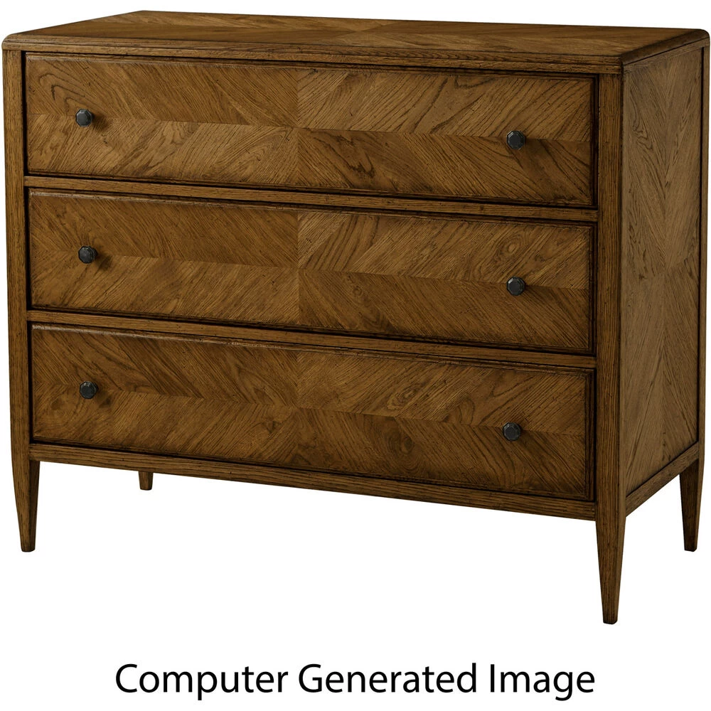 NOVA’s Chest Of Drawers, seen in our Dusk finish with an exquisite mirrored herringbone oak parquetry design, includes three oak sculpted drawers with Verde Bronze finished knobs and beautifully tapered oak legs.