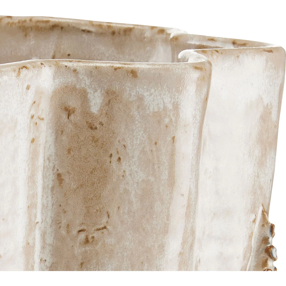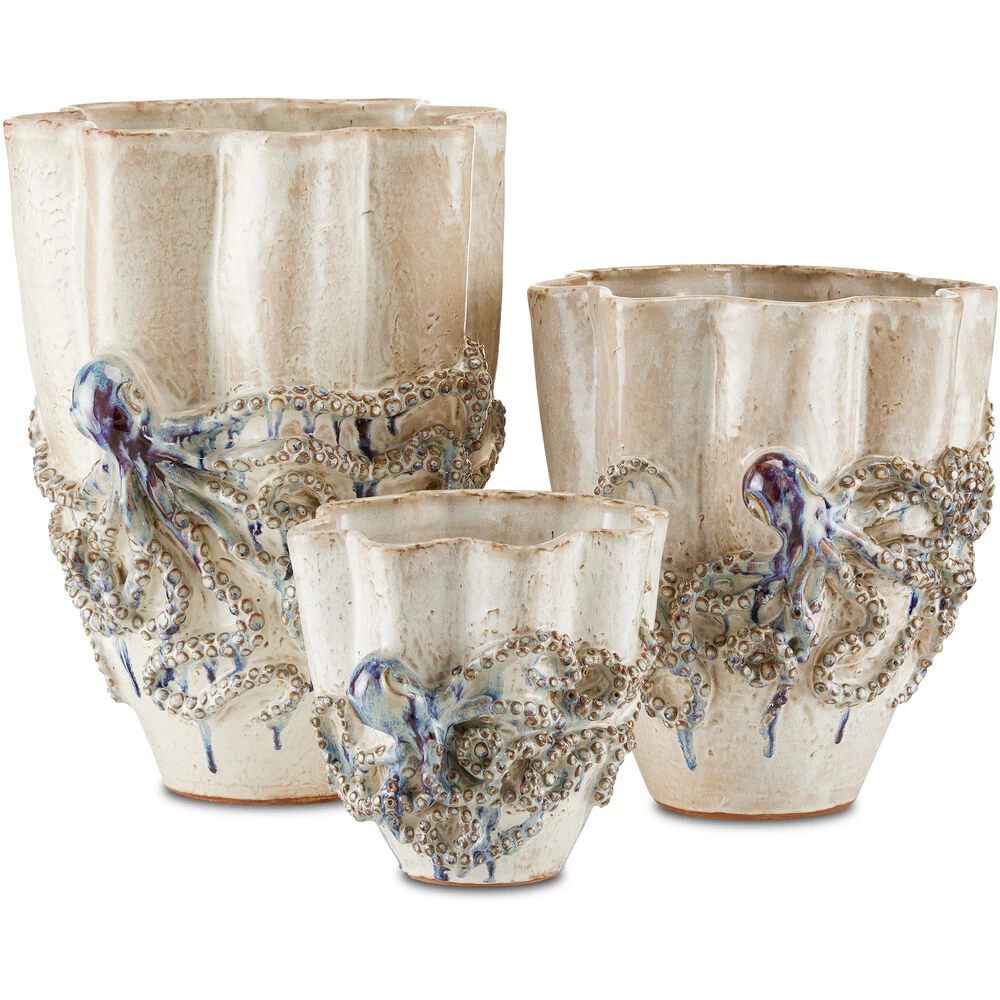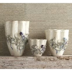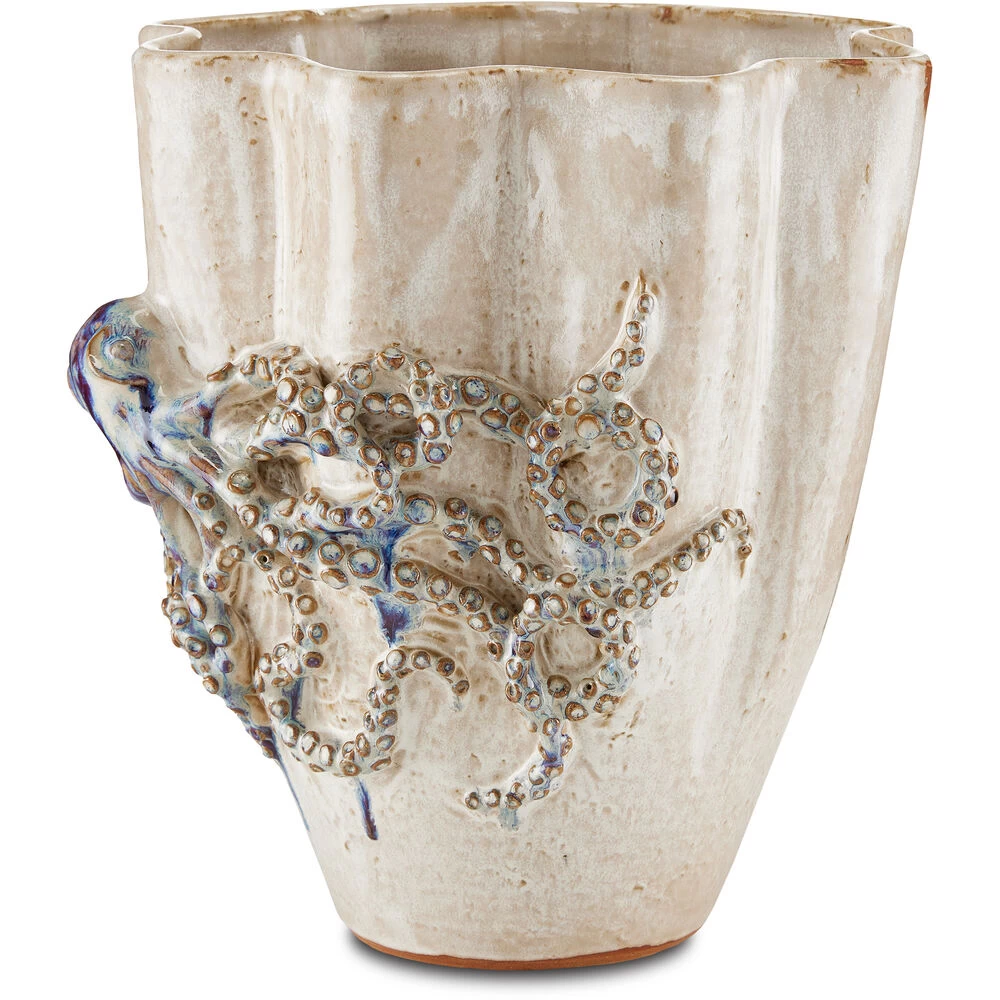 The Octopus Medium Vase is a decorative accessory handmade of stoneware by women artisans living at the border of Burma and Thailand. The process they used to create it is challenging and time-consuming. First the vase is thrown by one artisan; then another artist works by hand to apply the octopus to the profile of the cream vase before it is hand glazed and fired. The artful application and the dripping of the reactive blue glaze makes each piece a one-of-kind objet-d’art with a strong French Mediterranean feel.