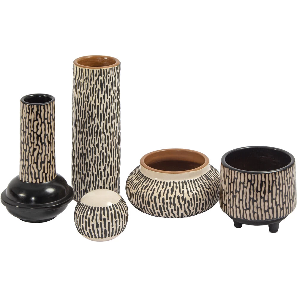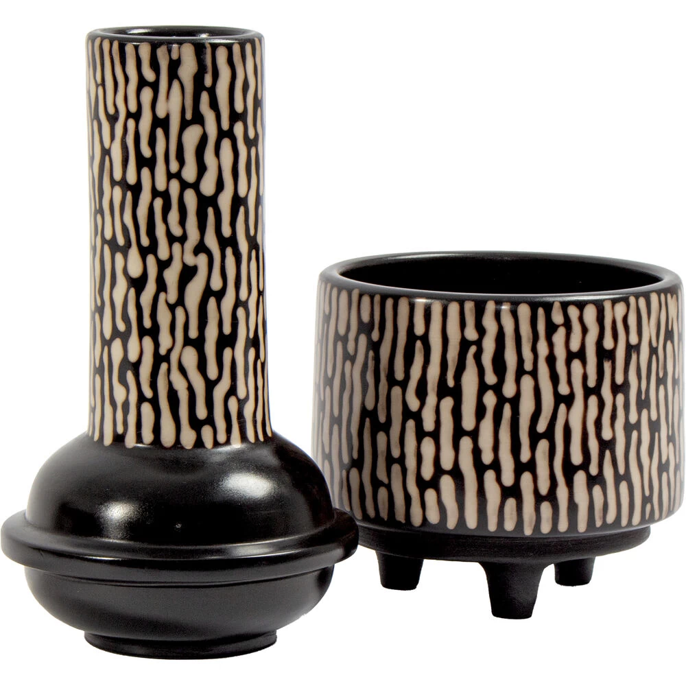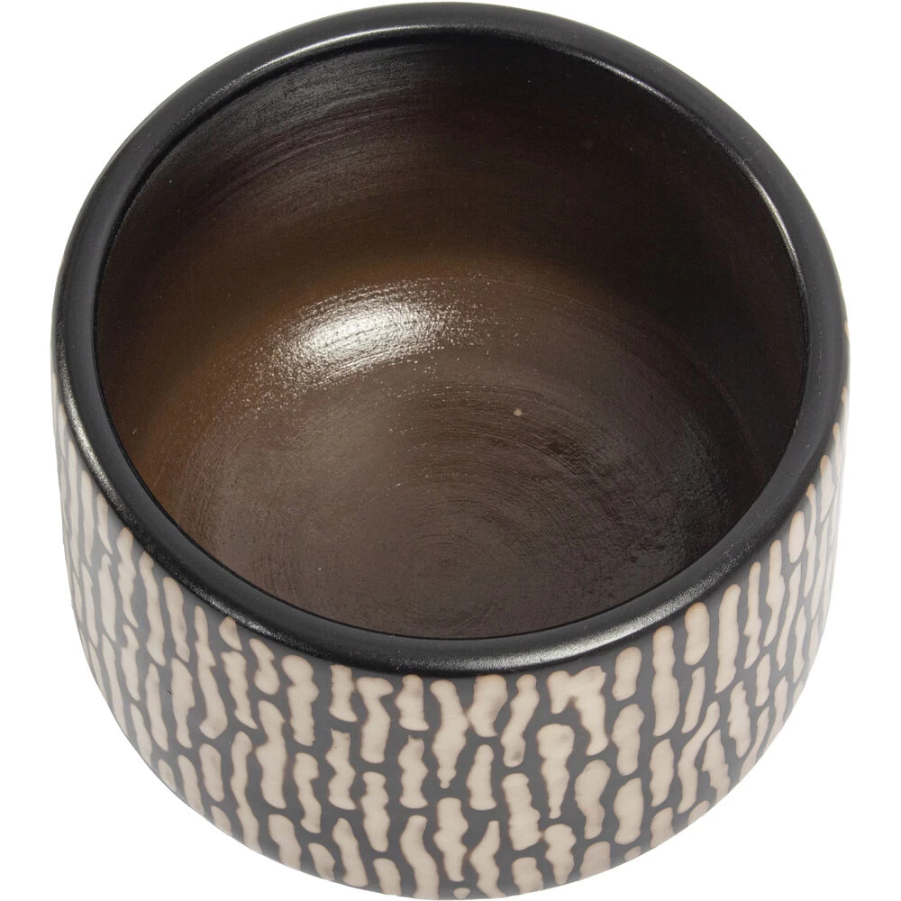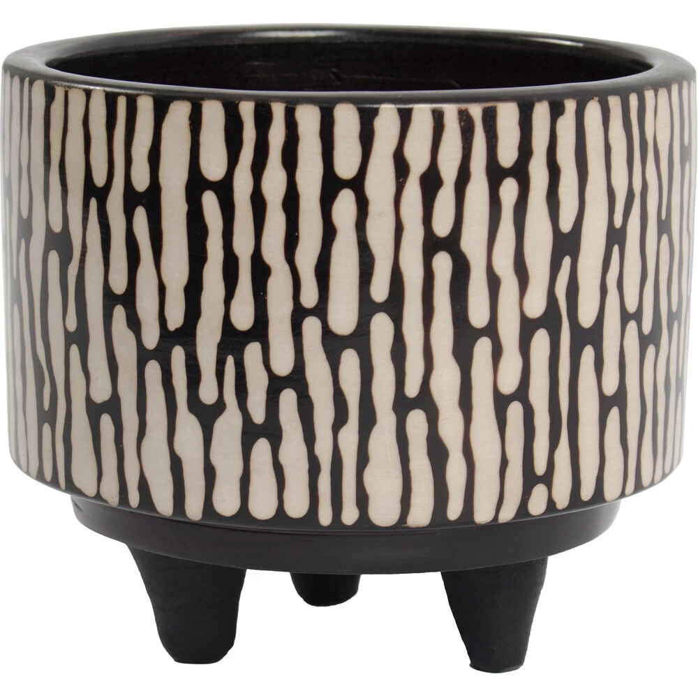 The Ofelia Planter is a wide footed ceramic planter with a two-tone finish. The surface of the planter features a raised squiggle motif in smoky black that contrasts beautifully with the creamy ceramic foundation.