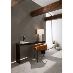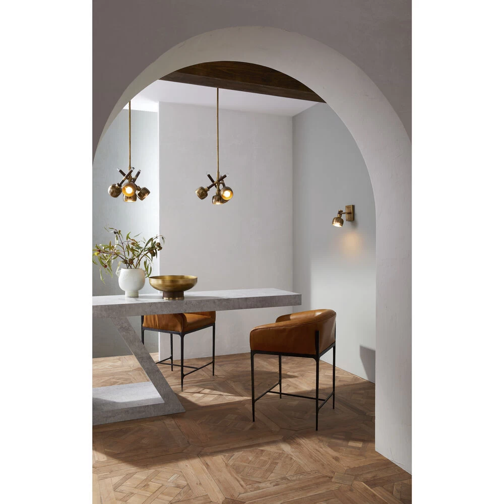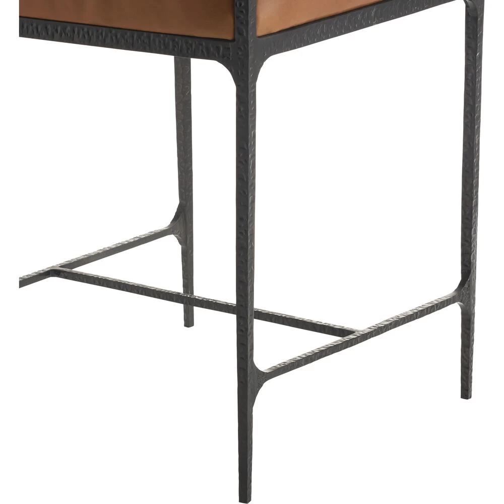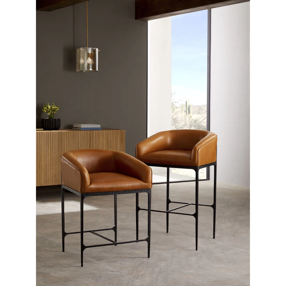 A hammered iron frame and handsome russet leather make this bar stool ultra-chic. The low, barrel-style shape gives lumbar comfort and support while allowing the stool to tuck neatly under a bar or countertop. Its modern style brings sophistication and polish to a space. Leather and finish will vary.