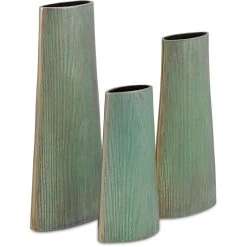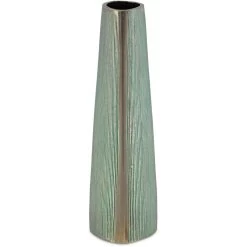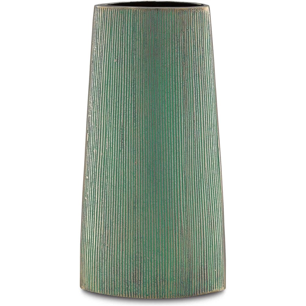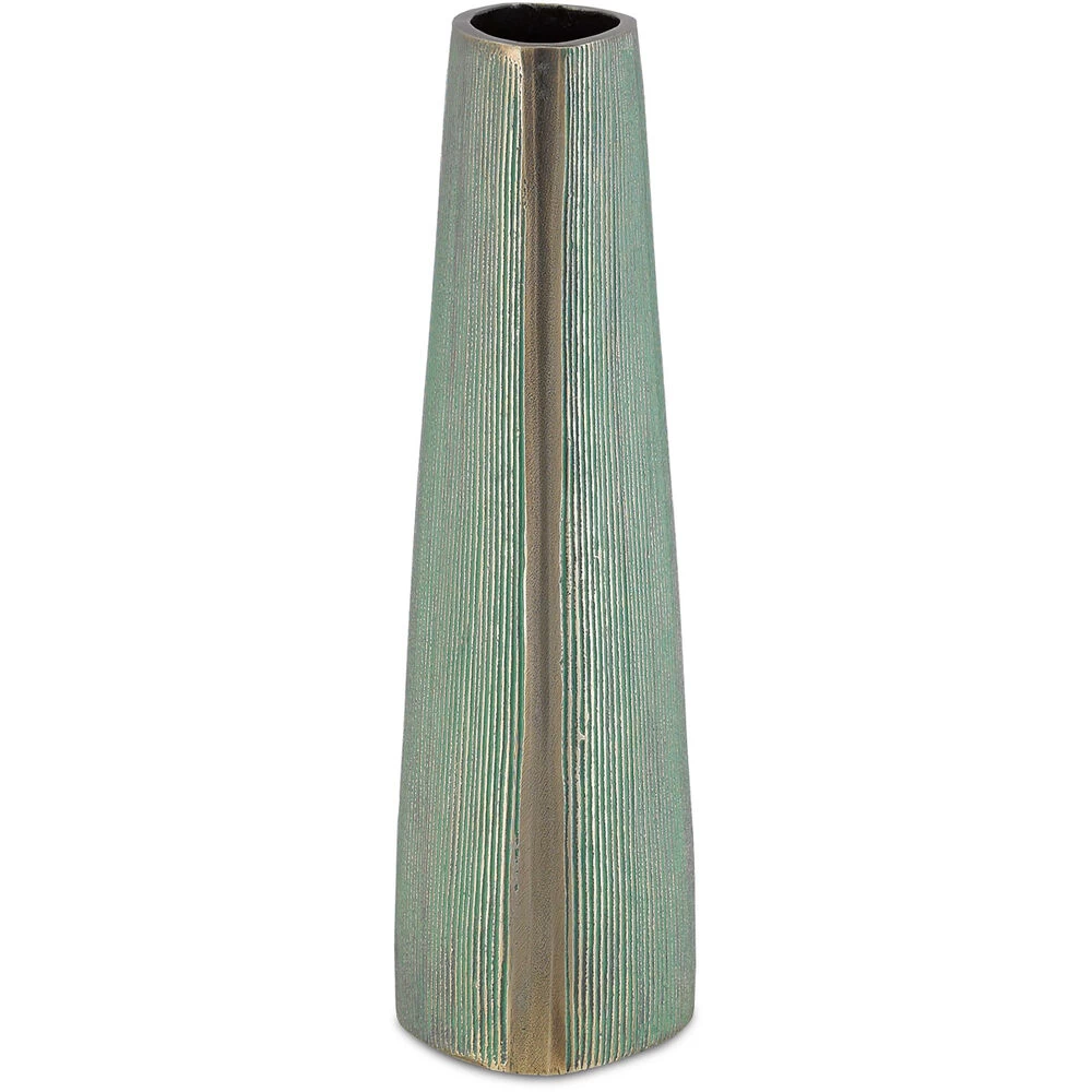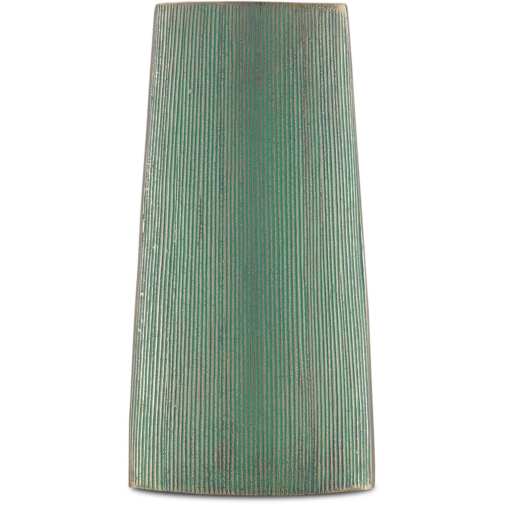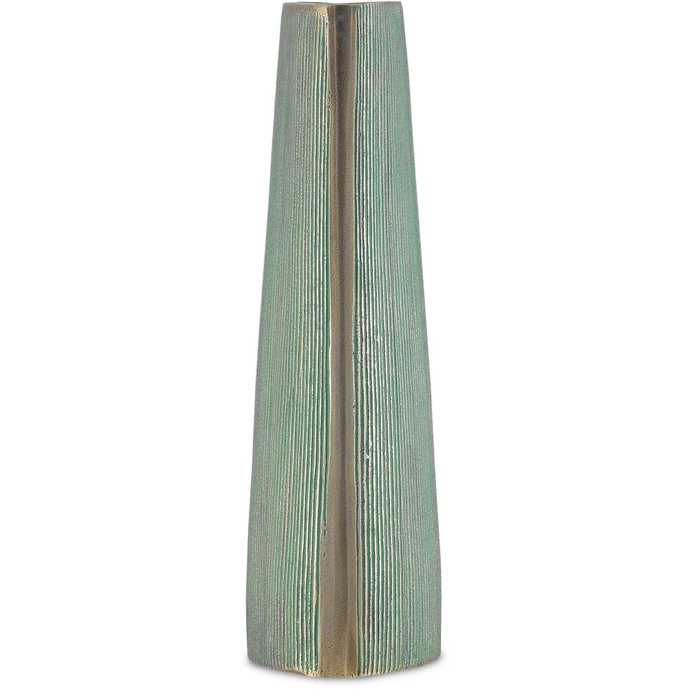 The Pari Green Small Vase is made of cast aluminum that has been enlivened with a green patina, the striations in the surface of the decorative vase upping the ante on the textural interest given the patina gathers in the crevices and is wiped away in spots on the higher lines. The aged feel of this piece can be credited to the artisans who hand-finish our decorative objects to make them appear as if they are one-of-a-kind. We offer the Pari in several sizes.