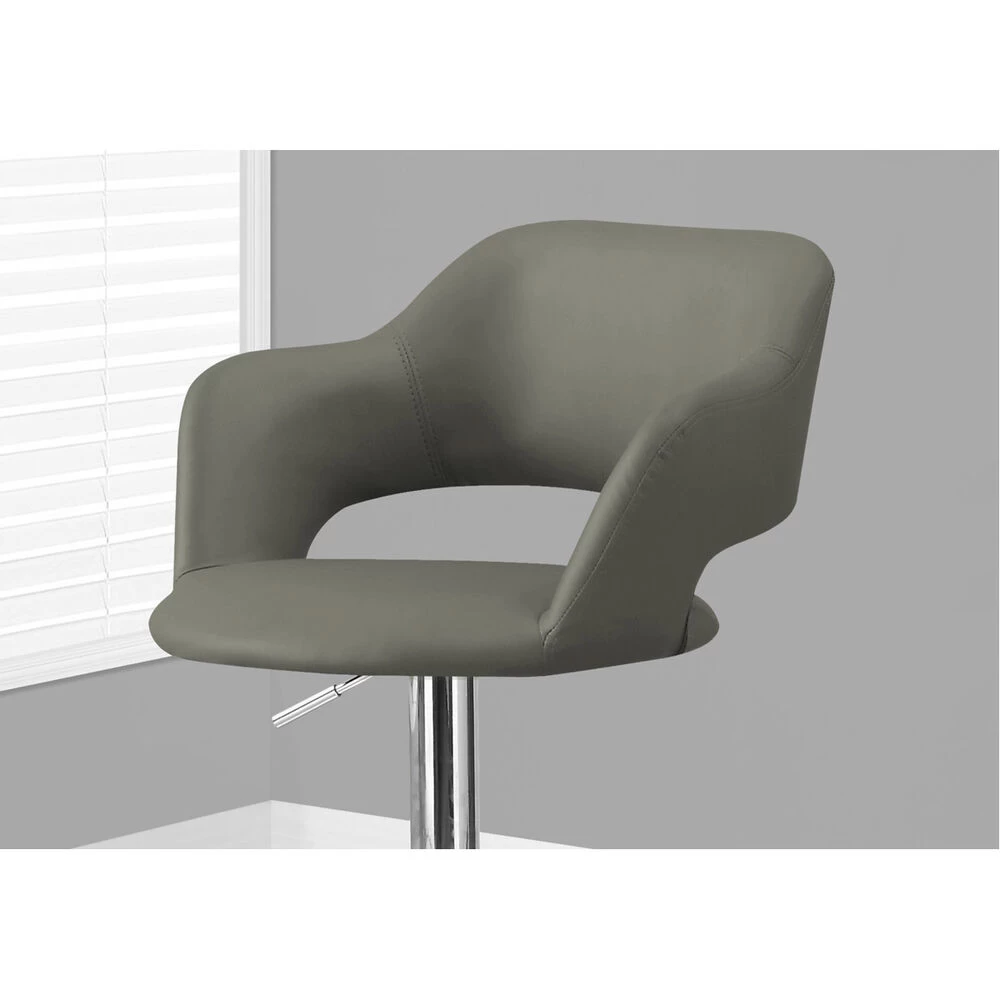 This cool contemporary bar chair will be a stylish addition to your casual dining and entertainment area. The plush curved stool back and seat is covered in grey leather-look fabric to complement your taste. A shiny steel base with a high polished chrome finish supports the chair. The hydraulic lift bar adjusts the seat height from 25 inches to 30 inches high with a chrome footrest below for comfort. Transform your home into a fun hangout with this stylish barstool.