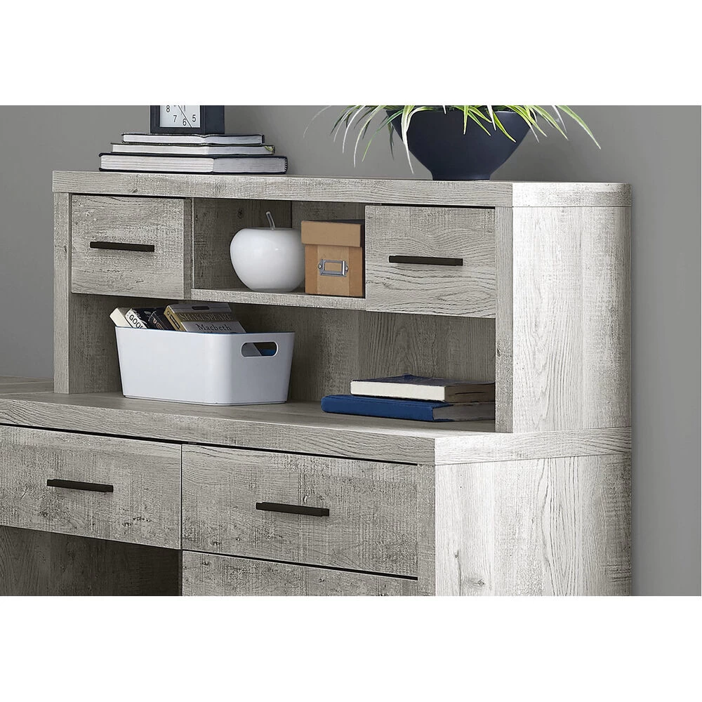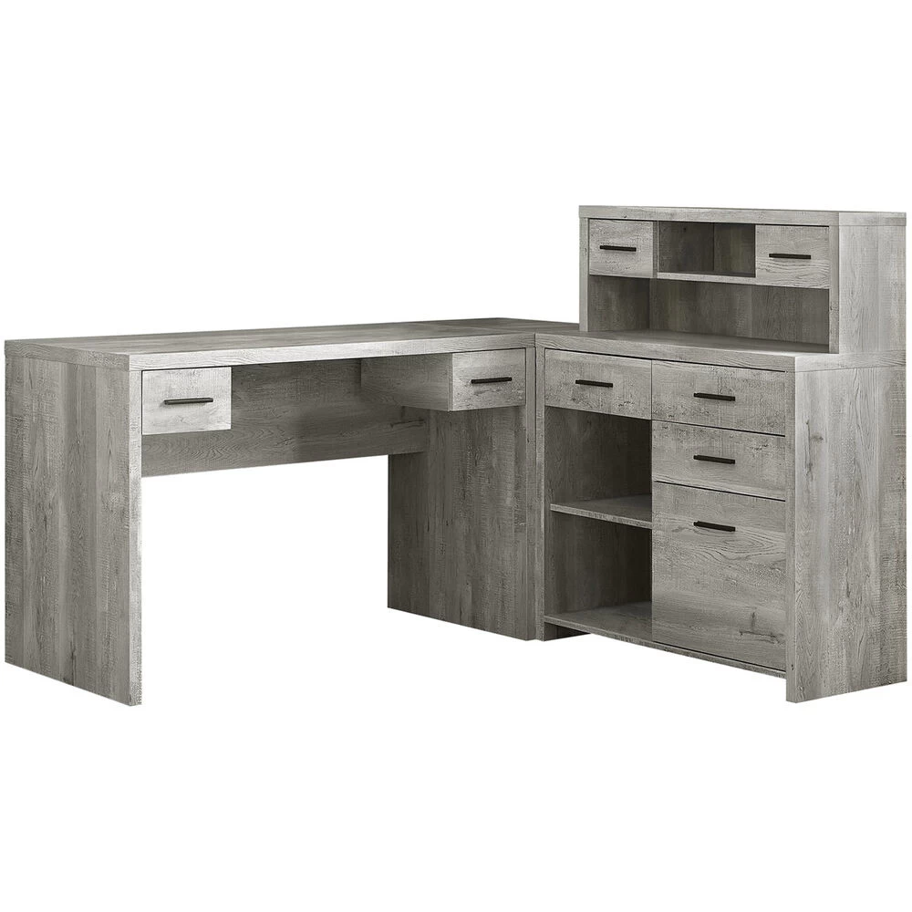 The trendy and industrial look of this L shaped desk finished in a chic grey reclaimed wood-look upgrades your home office or workspace with functional storage and style. This spacious desk provides two work surfaces, which can conveniently be assembled on the left or right hand sides or even placed side by side. There is ample space for a computer or laptop, a place to write, read and spread out your documents. The desk also features abundant drawer storage, a hutch and 3 open shelves, including an adjustable bottom shelf keeping all of your essential supplies within easy reach. This desk storage unit is a must-have for any home office.