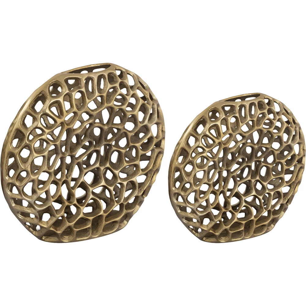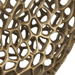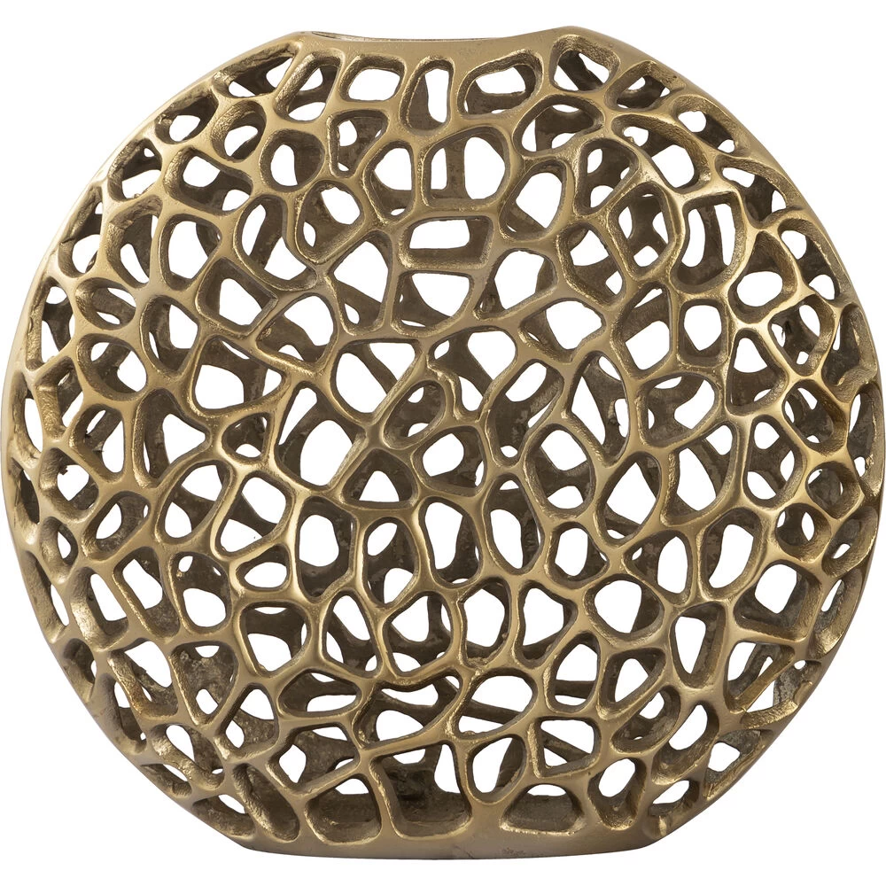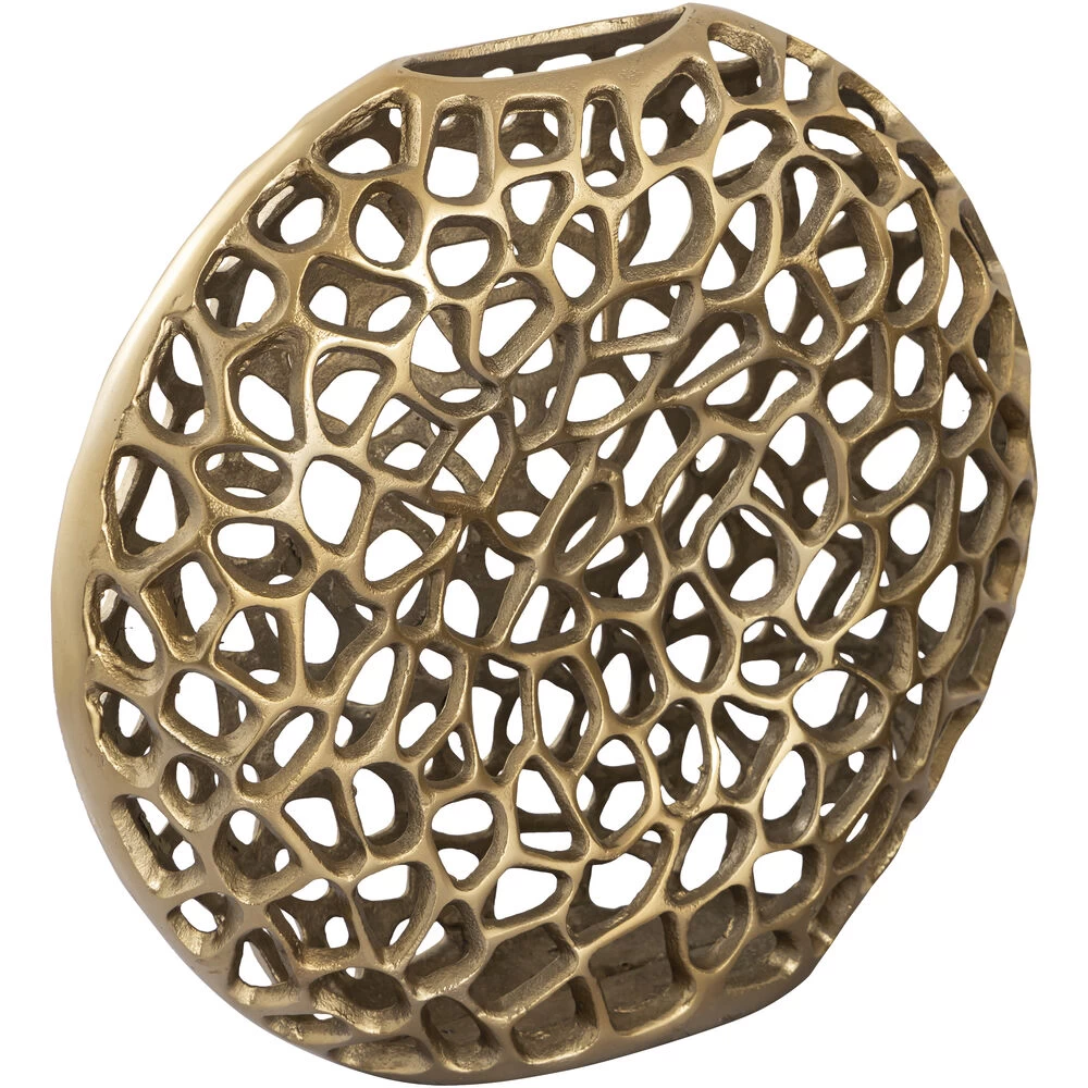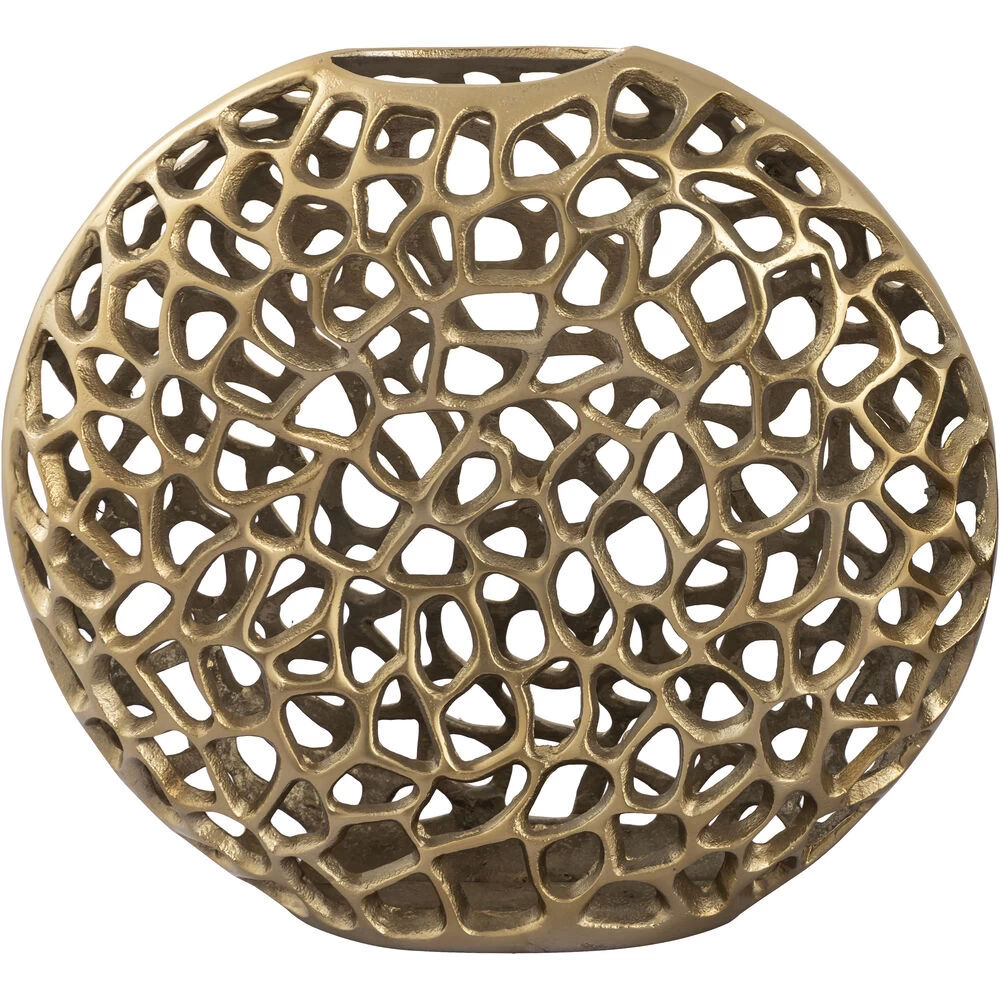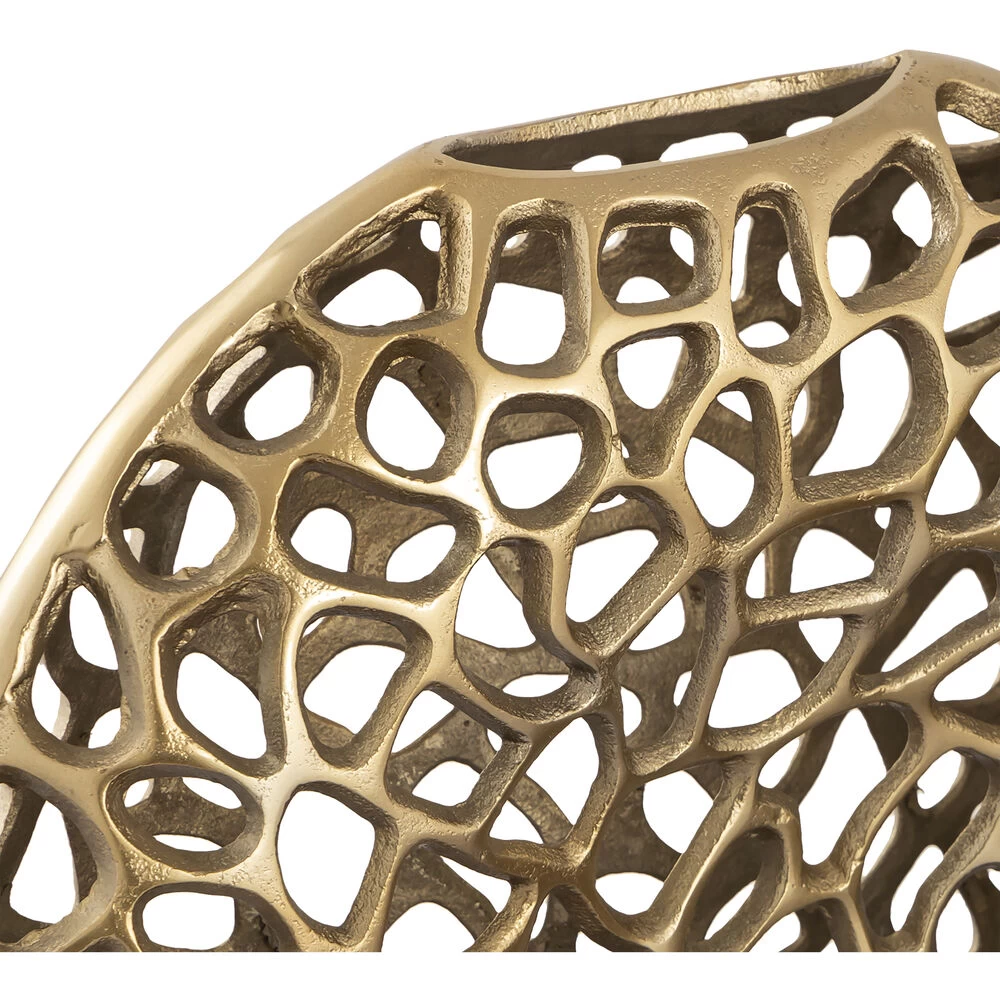 The open framework of the Reef Small Vase features an abstract, freeform coral pattern in a brass finish. This decorative vase does not hold water, and can be used to display branches or on its own as a sculpture on a bookshelf or credenza.