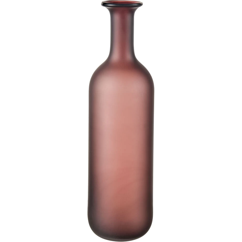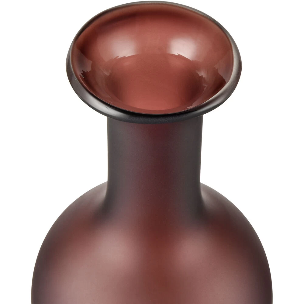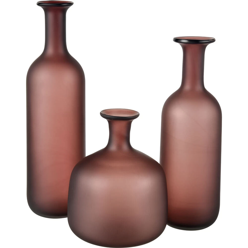 The Riven vases have a traditional bottle shape. The matte finished glass has a warm marsala color. Group together for maximum impact.