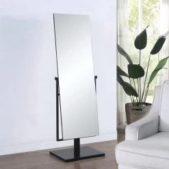 Set within the contemporary bedroom, this full-length standing mirror offers utility and style to the simple space. With a grand structure, this full-length mirror can take in one’s entire reflection from head to toe. Styled with minimal yet comforting furnishings and decor, it gleams brightly, enhancing the elements in its midst.