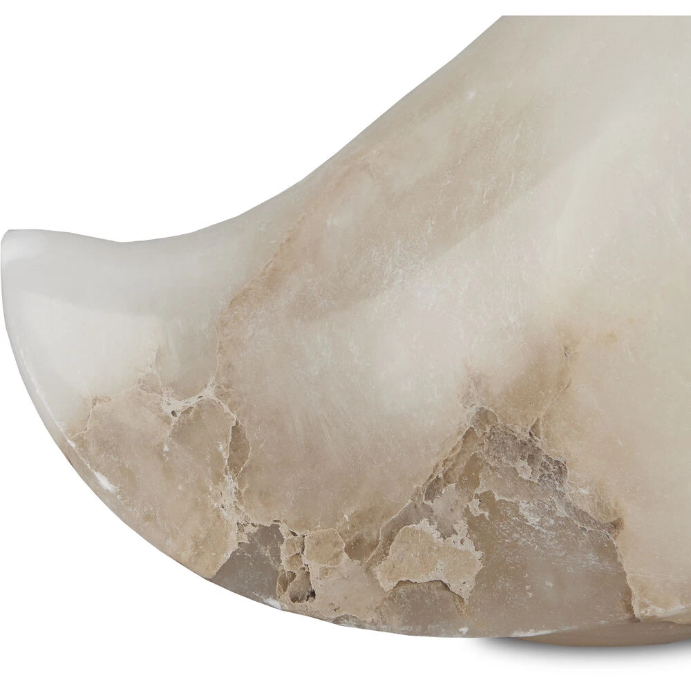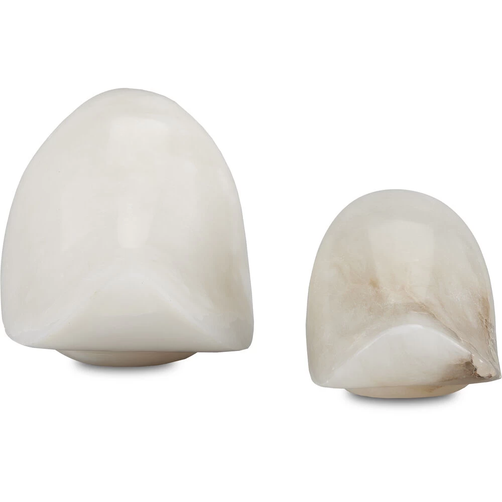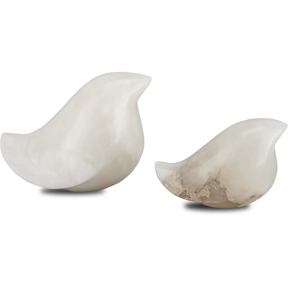 The Saras Bird Set includes two contemporary bird sculptures made of solid alabaster, which makes them luminous accent pieces. The white, black, and brown veining will differ from sculpture to sculpture because these decorative objects are made of a natural material, each one handcarved with smoothed surfaces.