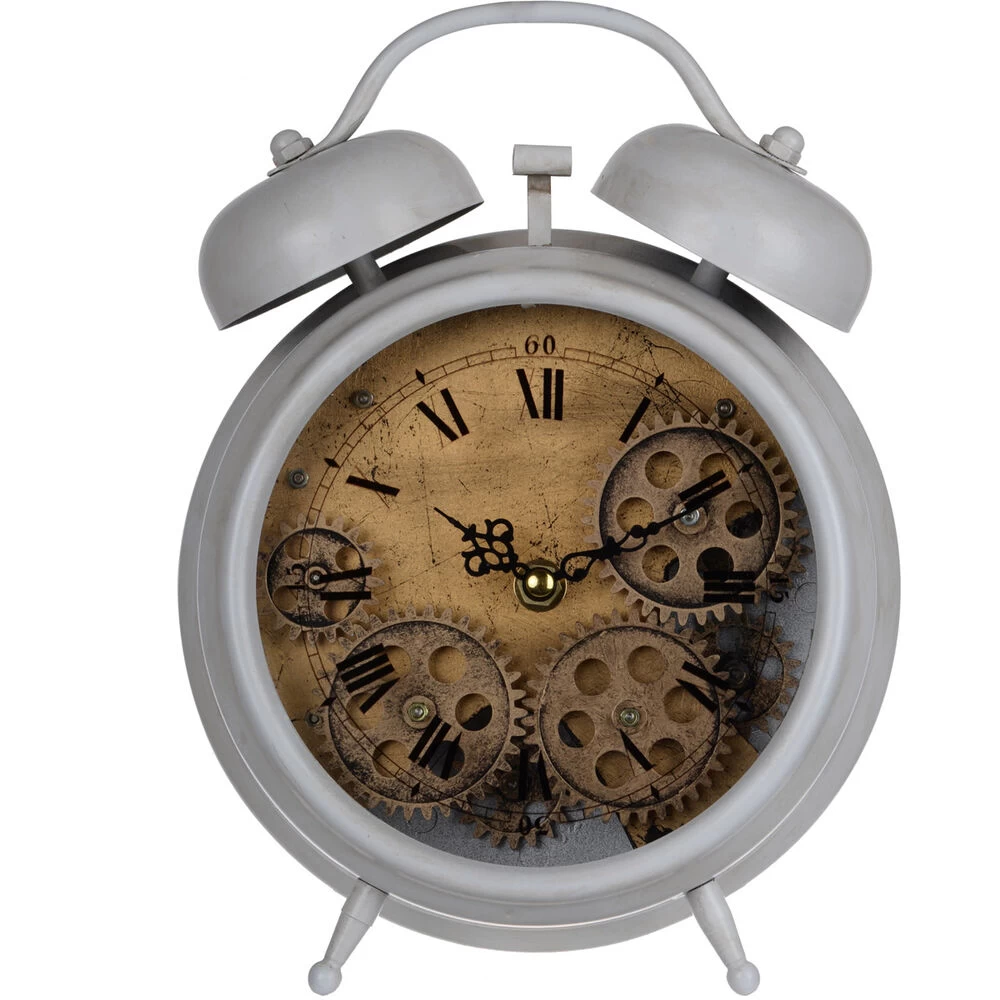 Tune up your time management skills with this unique industrial-style table clock. Crafted from iron and plastic, this clock features and open view of the mechanical gears on the dial. A white exterior finish completes the look.