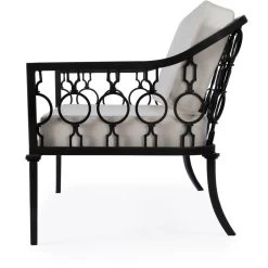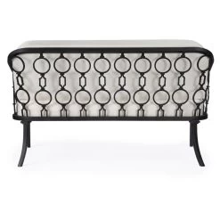 - Additional Product Construction Features: Frame is a Powder coated iron and finished with a clear lacquer with a geometric molded arm and back pattern and the seat is flat horizontal iron support bars. Seat cushion is secured to the base while the cushion back is removable.