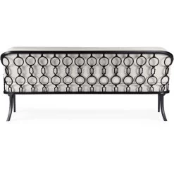 - Additional Product Construction Features: Frame is a Powder coated iron and finished with a clear lacquer with a geometric molded arm and back pattern and the seat is flat horizontal iron support bars. Seat cushion is secured to the base while the cushion back is removable.