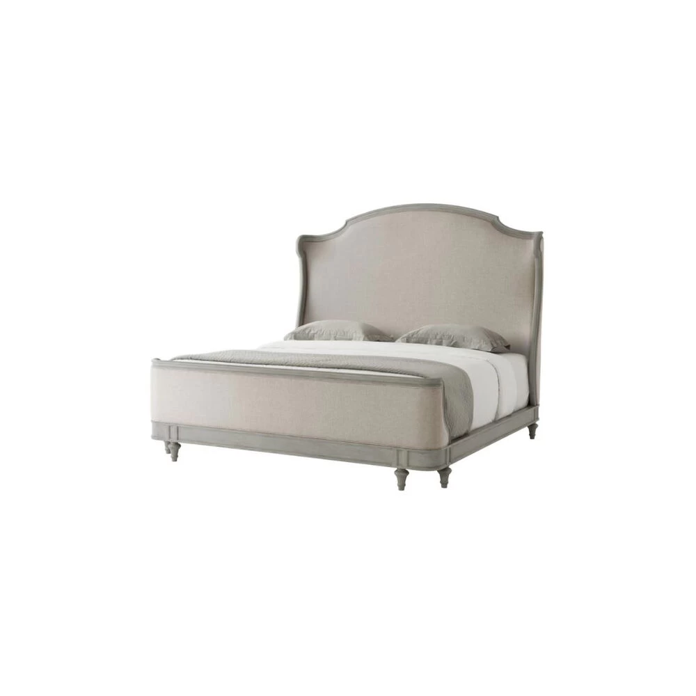 US King Bed Hand Carved Beech and Oak Veneered Arched & Molded Upholstered Headboard with Scroll Wings Upholstered & Hand Carved Framed Low Footboard Paneled Rails on Peg Feet