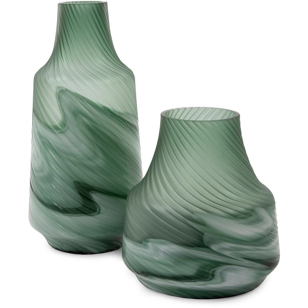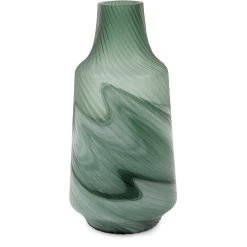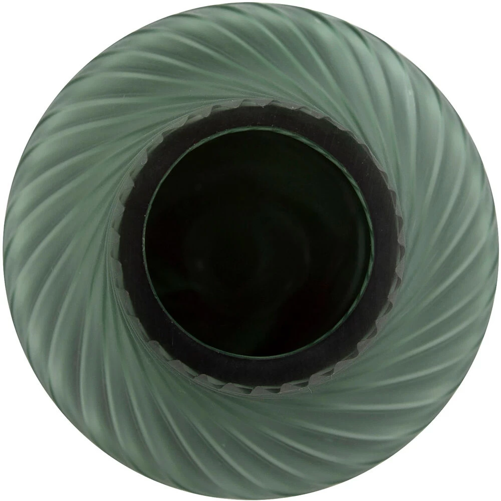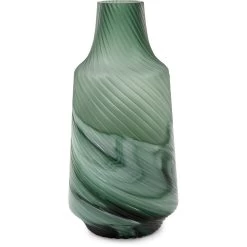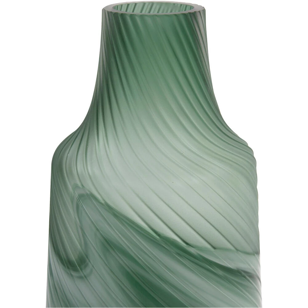 The teal color combines the calming properties of green with the renewal qualities of green. It is a revitalizing and rejuvenating color that we combined with a frosted top swirl texture and a fluid patterned base. The translucent and opaque finishes together highlight these vases quality and depth as a décor element.