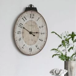 With its simple clock face, decorative numerals, and weathered look, the Thaddeus Oval Wall Clock from the Southern Living Collection adds an understated elegance to any space. Hang above an entryway table, on a kitchen wall, or above the living room mantle for a warm yet sophisticated look. The Thaddeus Wall Clock offers a casual, refined look that fits a variety of decors.