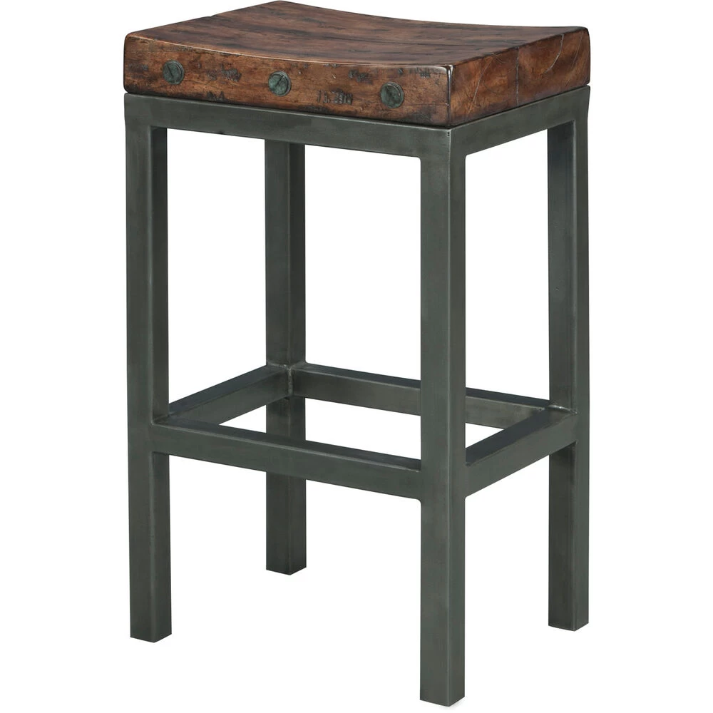 A Byron finish bar stool, the shaped plank seat with bold brass bolts, on a gunmetal iron base.