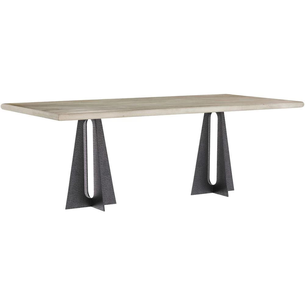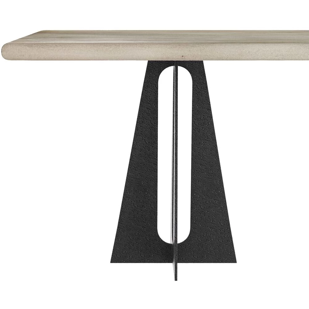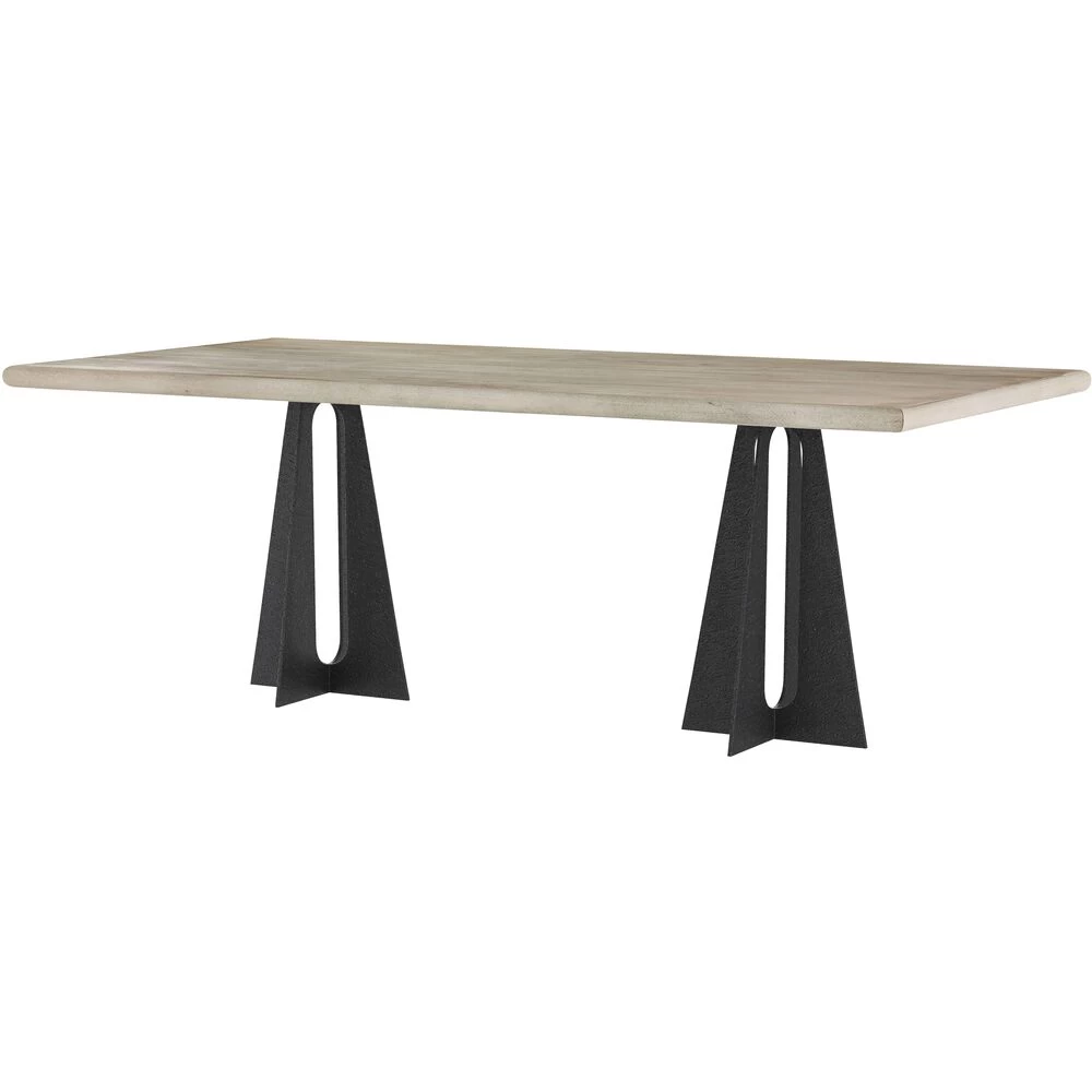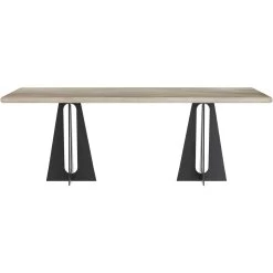 A commanding presence in any dining room, our modern and masterful tobin dining table is conceived in contrasting materials, with a design bearing ample visual weight. With brutalist design origins, the table is created with a smoke oak top that sits atop open, intersecting planes of heavily hammered, blackened iron pedestals. Finish will vary.