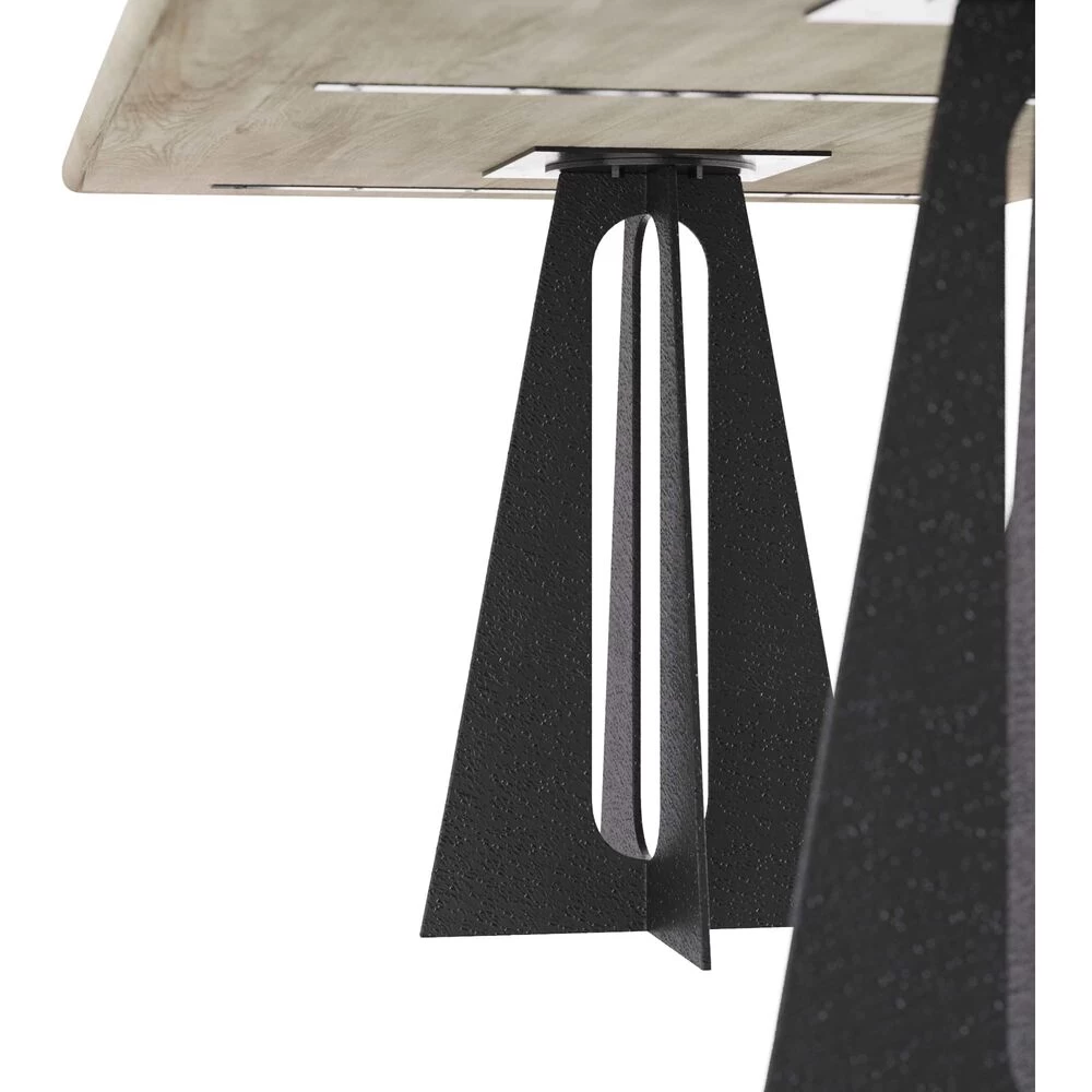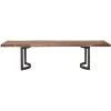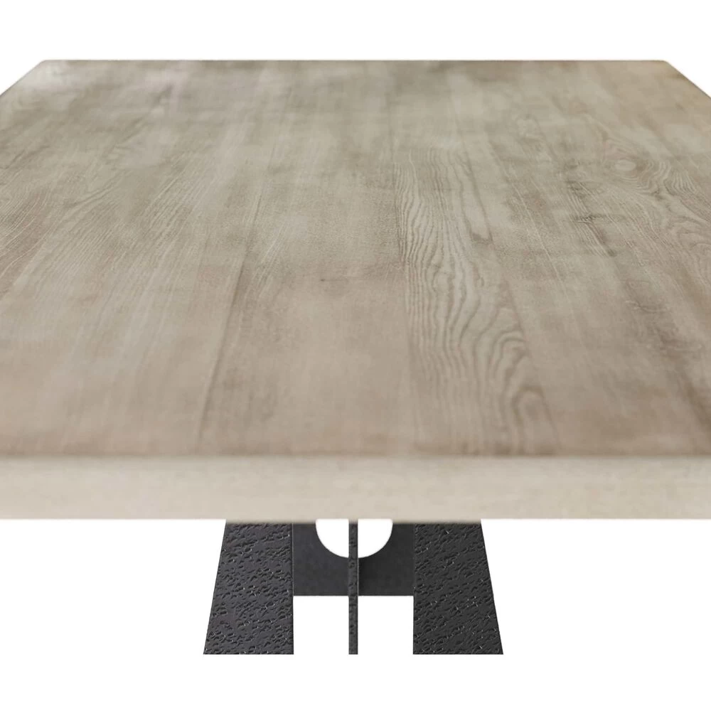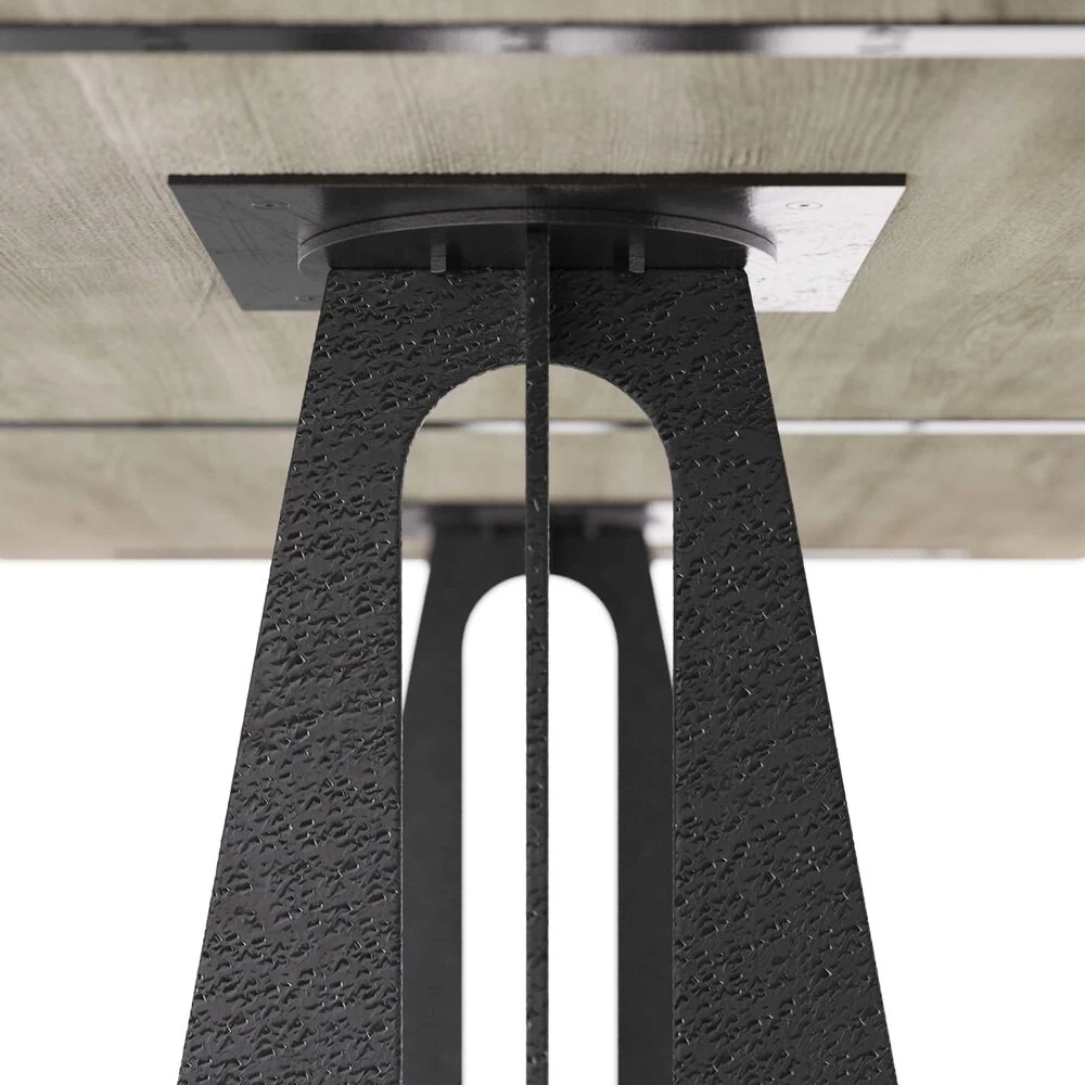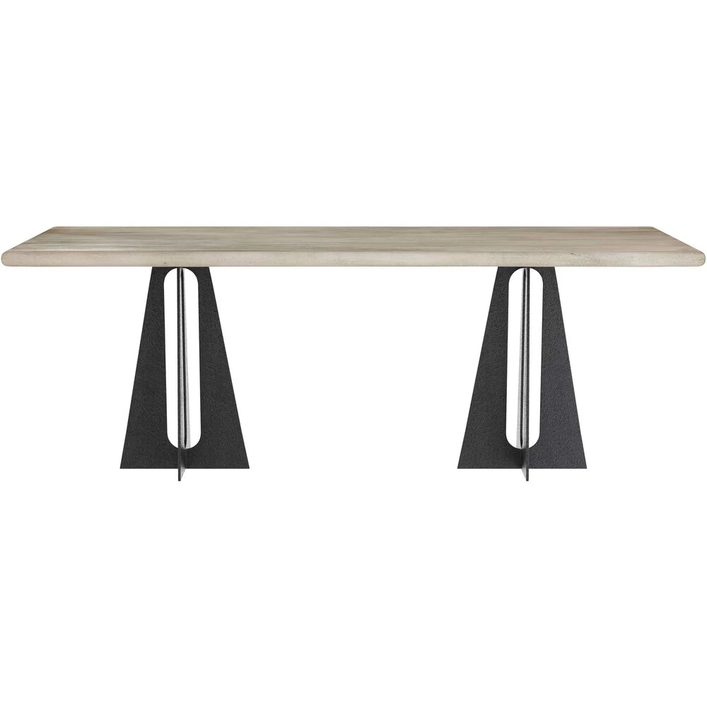 A commanding presence in any dining room, our modern and masterful tobin dining table is conceived in contrasting materials, with a design bearing ample visual weight. With brutalist design origins, the table is created with a smoke oak top that sits atop open, intersecting planes of heavily hammered, blackened iron pedestals. Finish will vary.