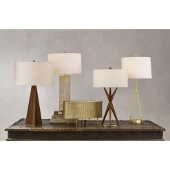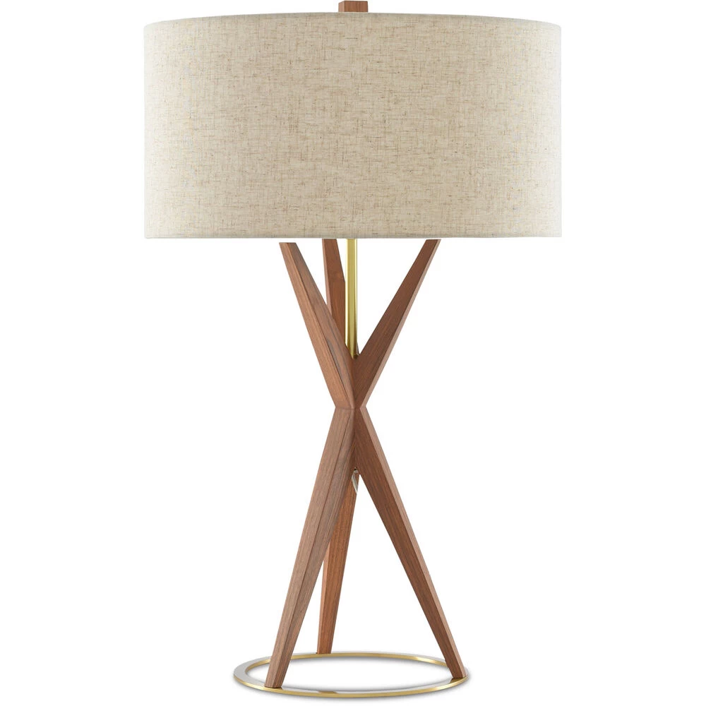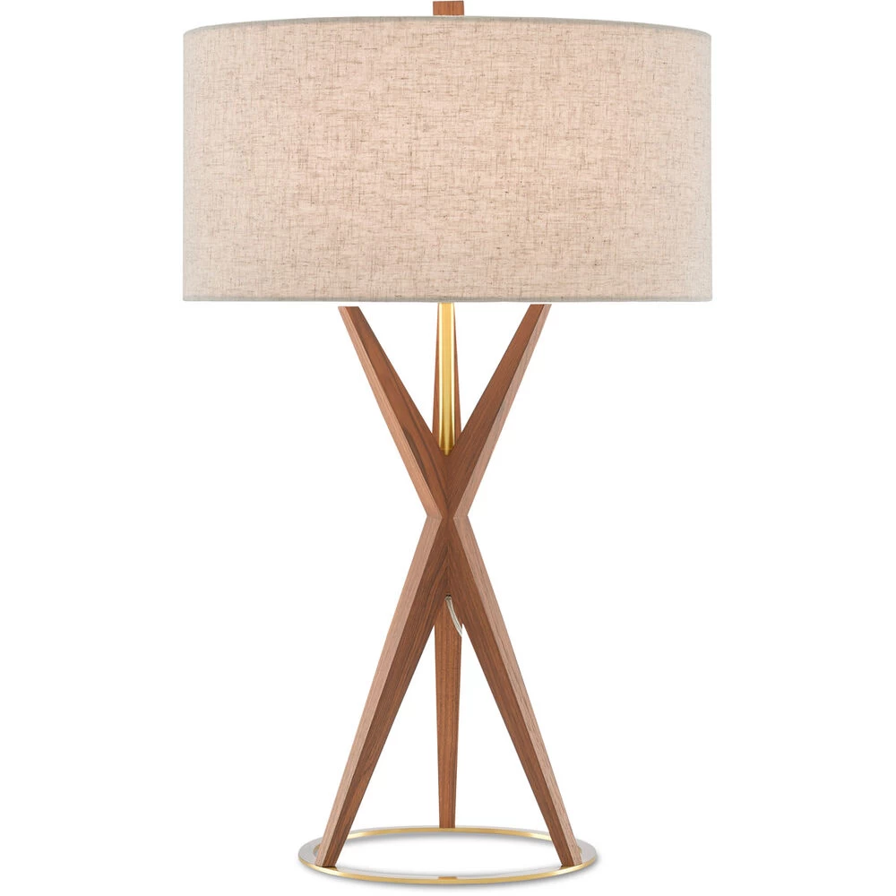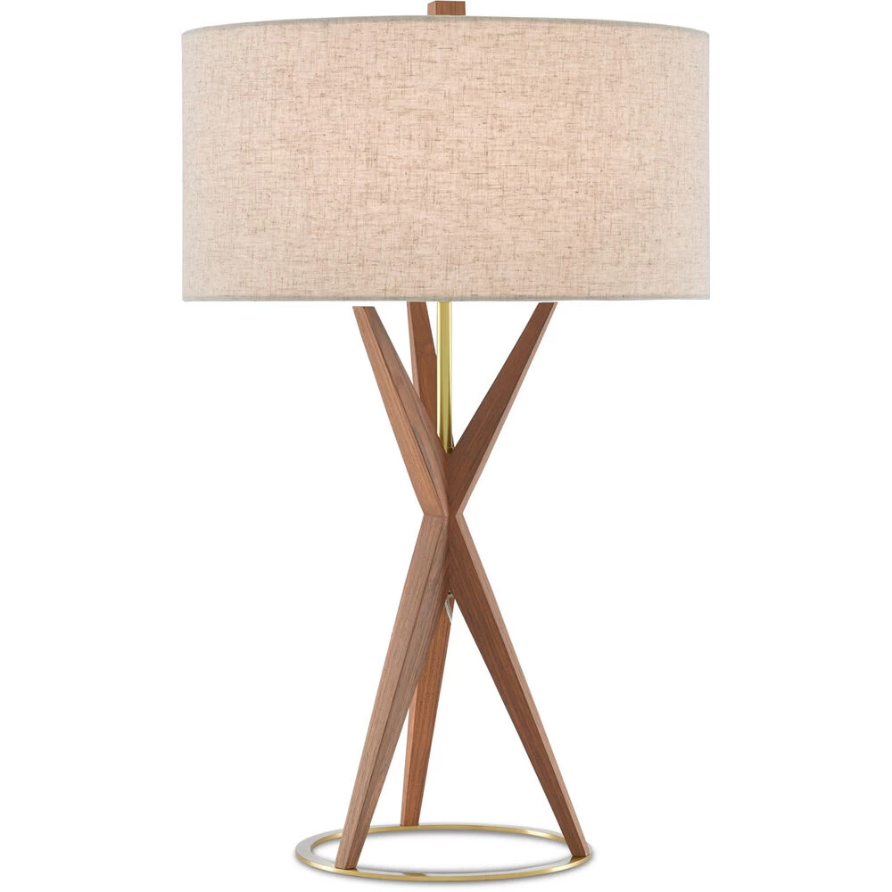 The angularity of the Variation Table Lamp reads like a design ripped straight from the mid-century, but itβs far too modern to be typecast in that elemental era. Made of wood treated to a teak finish, the articulated body extends from a base made of brass in a brushed-brass finish toward a natural linen drum shade fastened to the wood lamp by a matching finial.