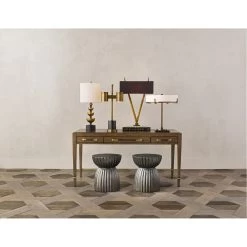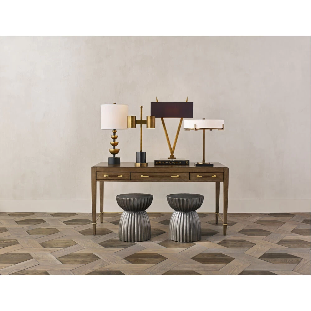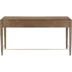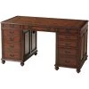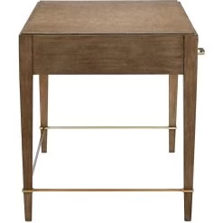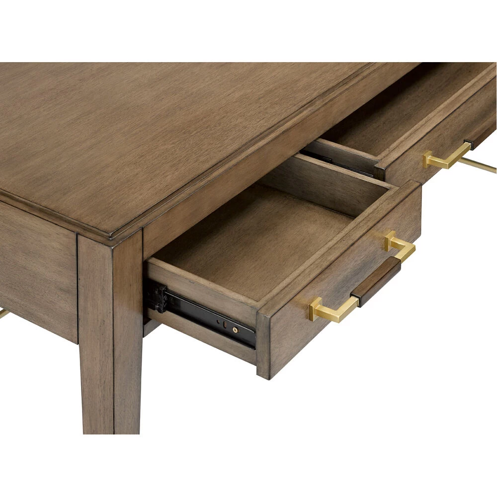 X marks the spot when the Verona Chanterelle Desk is introduced into a room. Made of mahogany that has been treated to a woodland-inspired chanterelle finish, it has been given a sexy touch of gold with the champagne-finished iron and coffee-finished brass detailing. This is one of our pieces that proves the brilliance of our design team, as the stretchers that clasp each leg are so chicly rendered, they artfully meet at a crosshatch in the middle of the negative space. Other features are adjustable glides and solid mahogany dovetail drawers. There are a number of pieces in several finishes in the Verona family of furnishings.