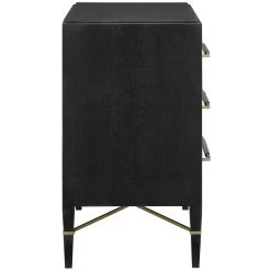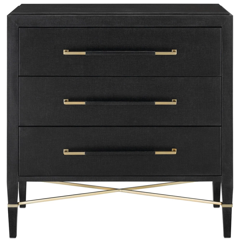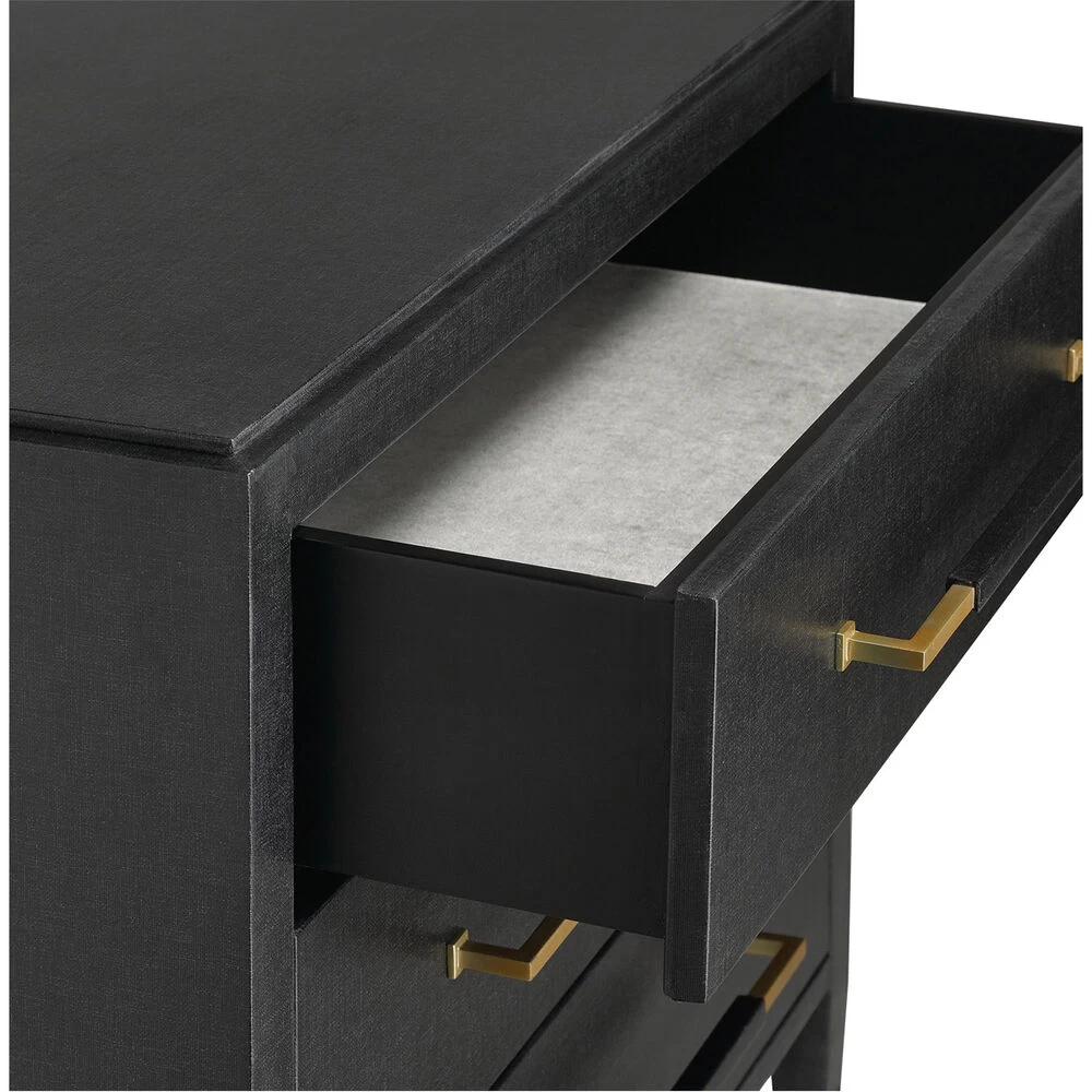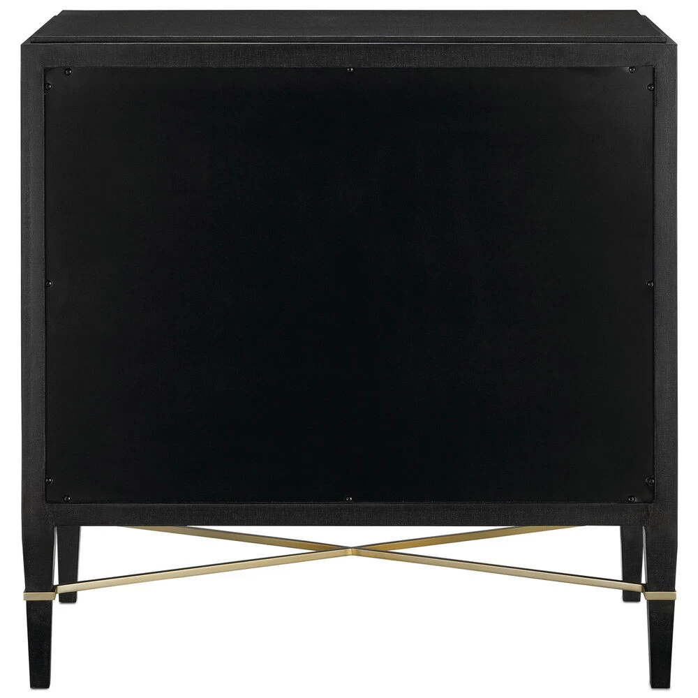 X marks the spot when the Verona Chest is introduced into a room. The black beauty with its sexy touch of gold is covered in black lacquered linen that is accented with champagne-finished metal detailing. This chest has so much style, it will be the scene of many a joyous good-nights. Design details include linen-wrapped metal handles, soft-close door hinges, adjustable glides, solid mahogany French dovetail drawer boxes, removable drawer liners and an anti-tip kit. There are a number of pieces in the Verona family of furnishings.