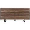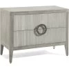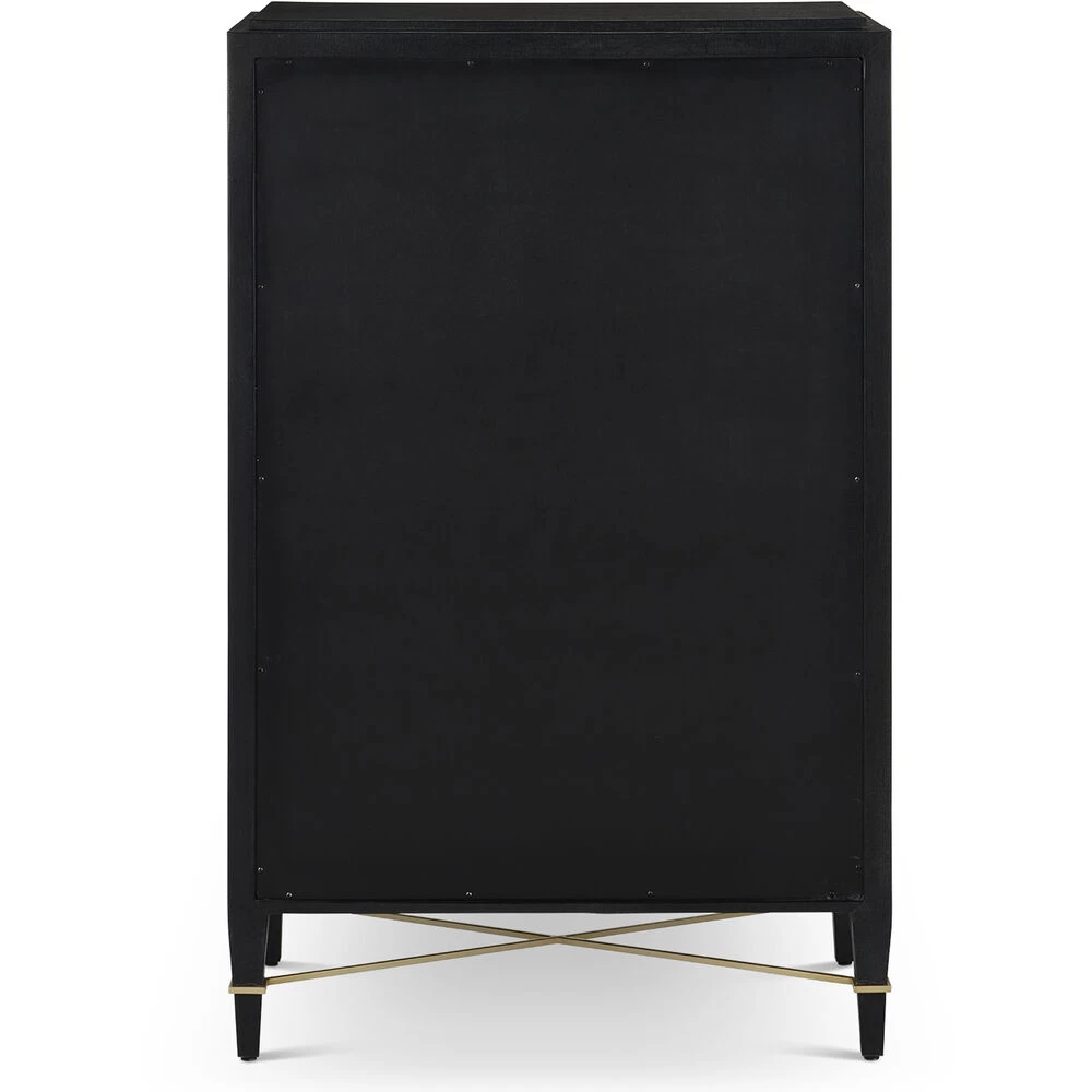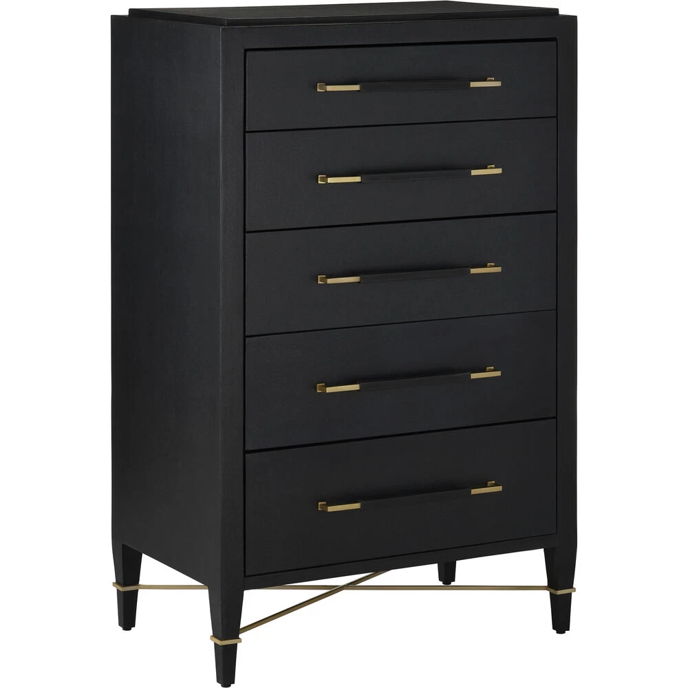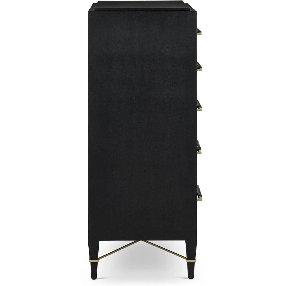 The Verona Black Five-Drawer Chest is darkly handsome covered in black lacquered linen with metal detailing in a champagne finish. The stretchers on this black chest create added interest to enhance its flair. The beautifully detailed drawer pulls, which are wrapped in matching material in the middle and left bare on each end, grace each drawer with their metallic sheen. This is a sophisticated touch, as are the squared edges of the hardware that match the straight-edges on the stretchers. Aimee Kurzner designed the chic Verona family of products.