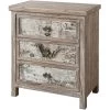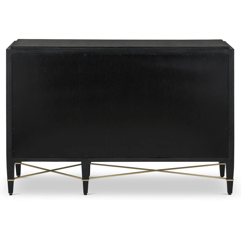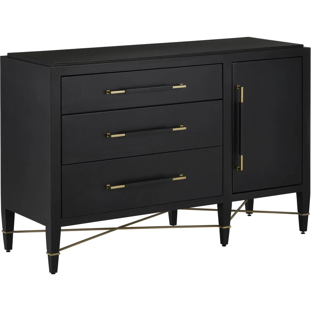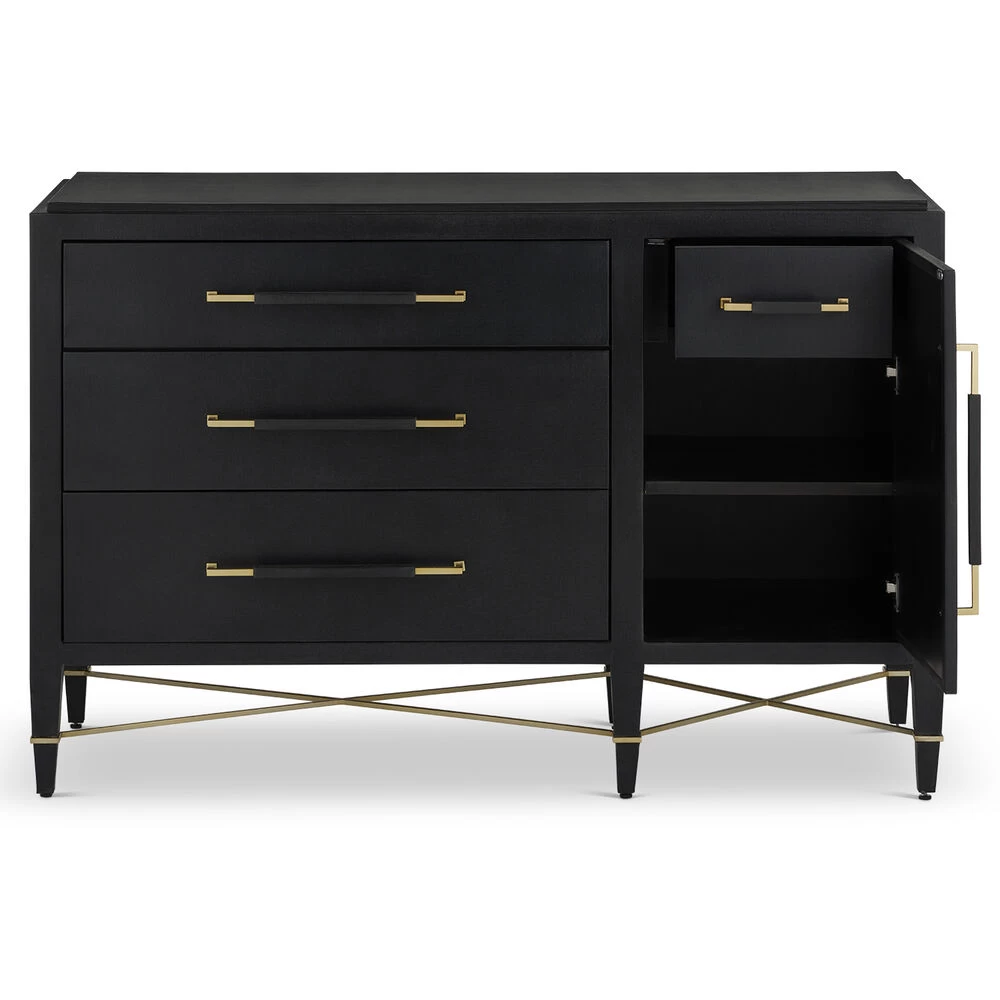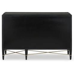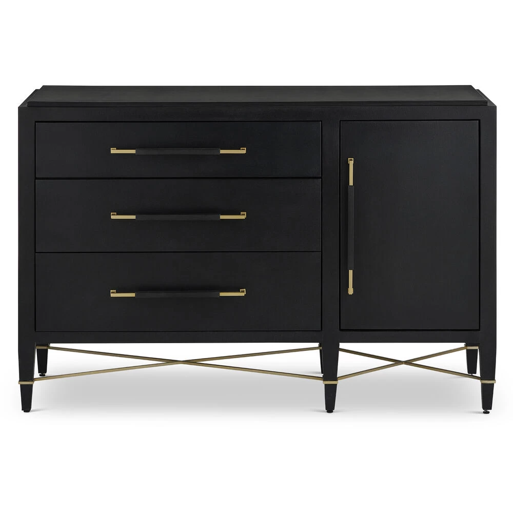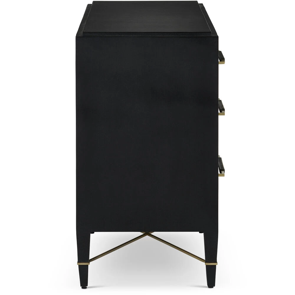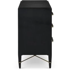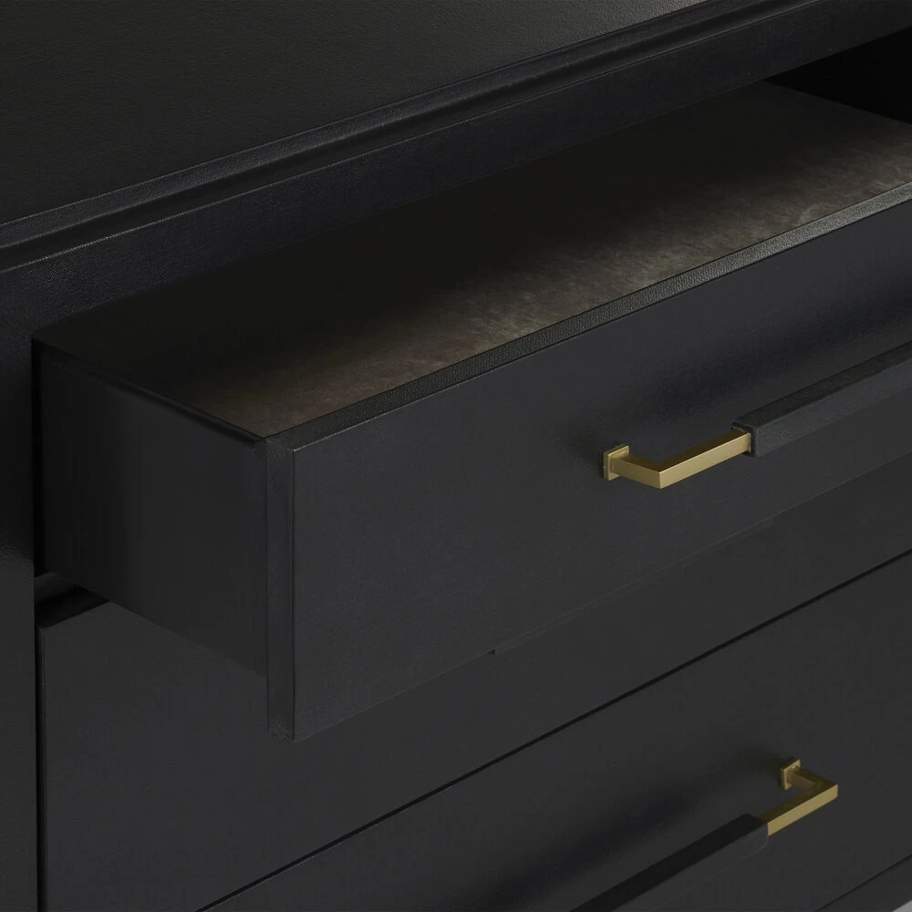 The Verona Black Three-Drawer Chest is darkly handsome covered in black lacquered linen with metal detailing in a champagne finish. The stretchers on this black chest create added interest to enhance its flair. The beautifully detailed drawer pulls, which are wrapped in matching material in the middle and left bare on each end, grace each drawer with their metallic sheen. This is a sophisticated touch, as are the squared edges of the hardware that match the straight-edges on the stretchers. The door with its single pull, which hides a two shelves and a drawer, is an elegant design move. Aimee Kurzner designed the chic Verona family of products.