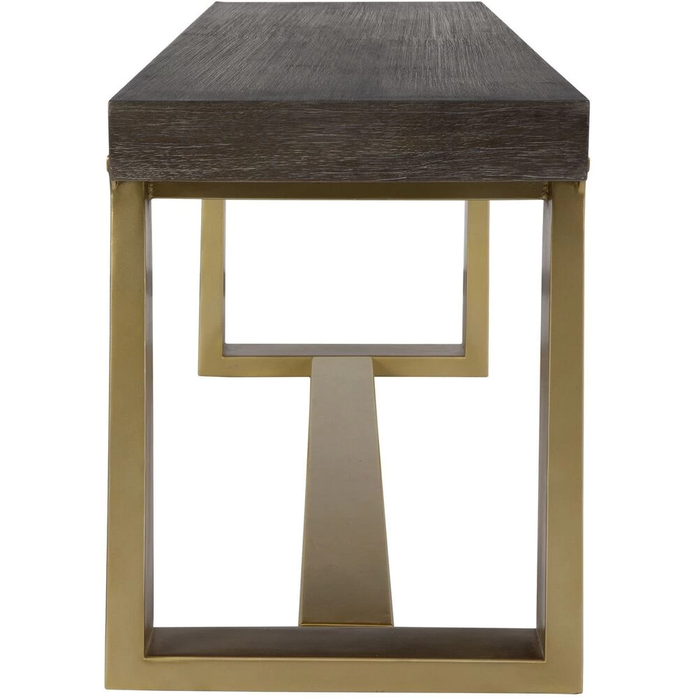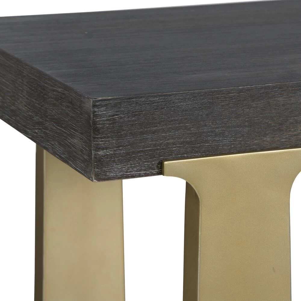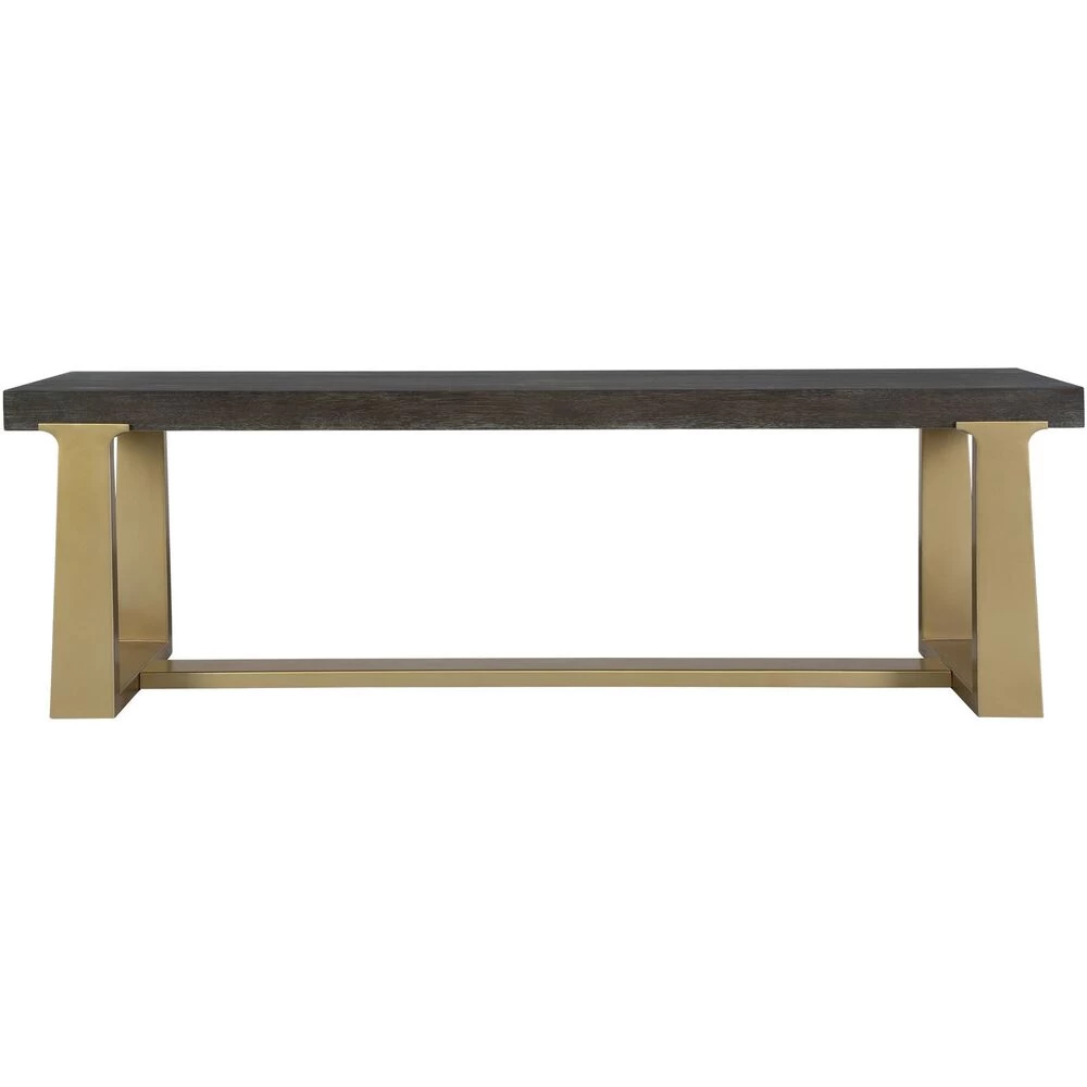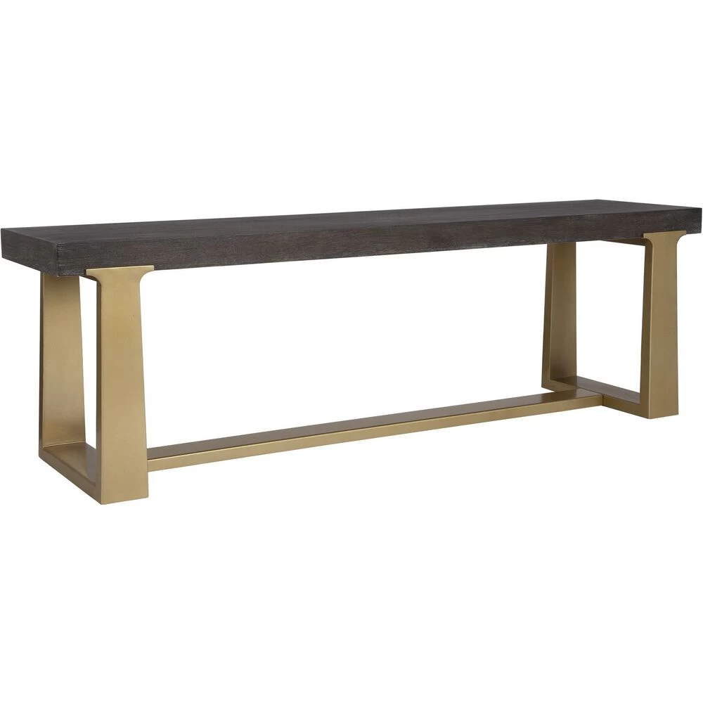 Contemporary In Style, This Stately Bench Features A Thick Iron Based Finished In Warm Brushed Brass That Supports An Acacia Solids And Veneered Top With A Gray Glazed Walnut Finish.
