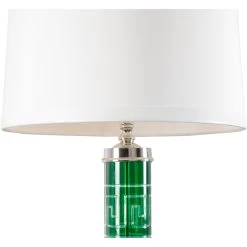 Inspired By Ancient Architecture, Servus Lamp Features The Classic Greek Key Design Etched In A Column Of Green Glass. Supported On A Polished Nickel Mount With A Three Way Socket, This 24″ Accent Lamp Is Ideal For An Entryway, Bedroom Or Living Area. An Off White Silk Drum Shade Brings A Hint Of Elegance As It Diffuses Luminous Light Throughout Your Space.