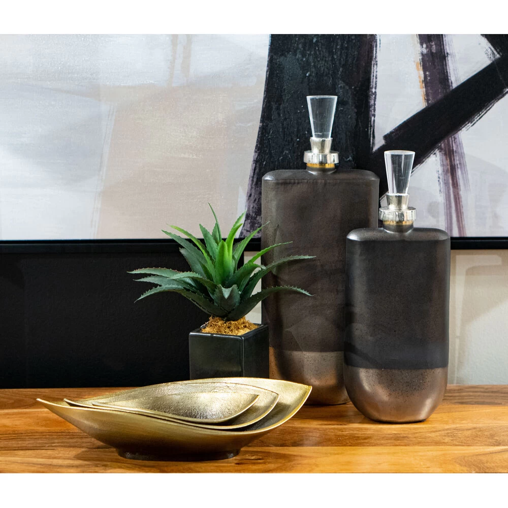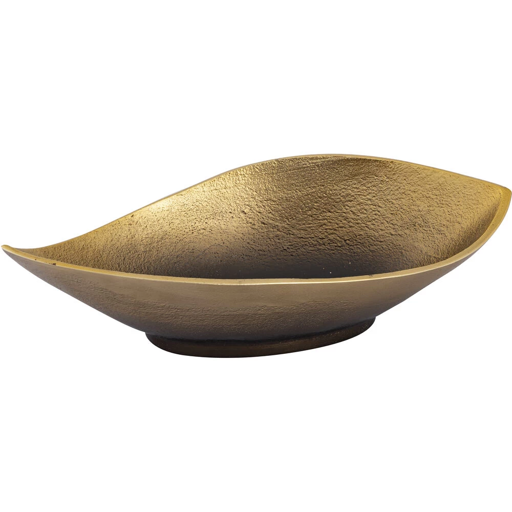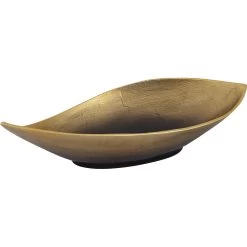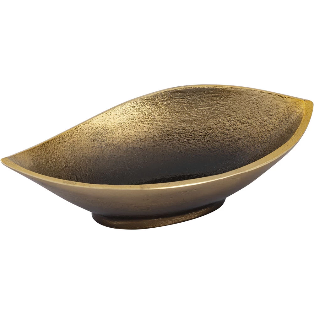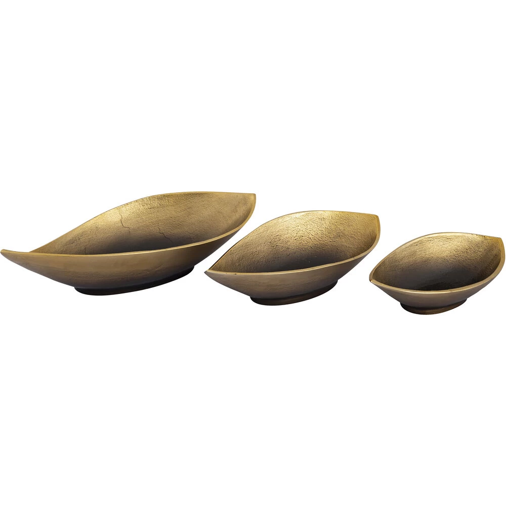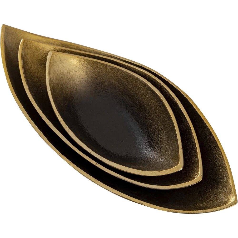 The Willow Bowls, sold as a set of three, are made from aluminum with an antique gold ombre finish. Each bowl is a different size, and each has an elongated, slightly amorphic leaf shape, adding to their organic appeal.