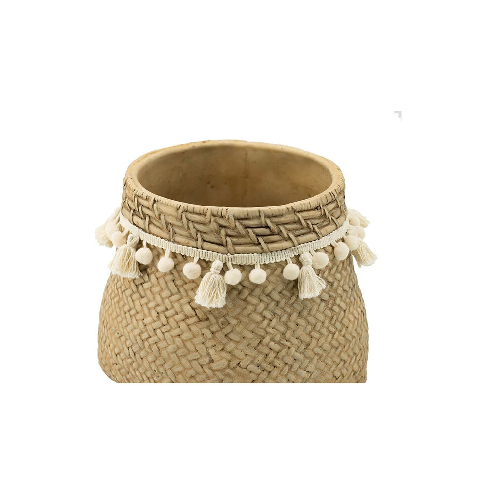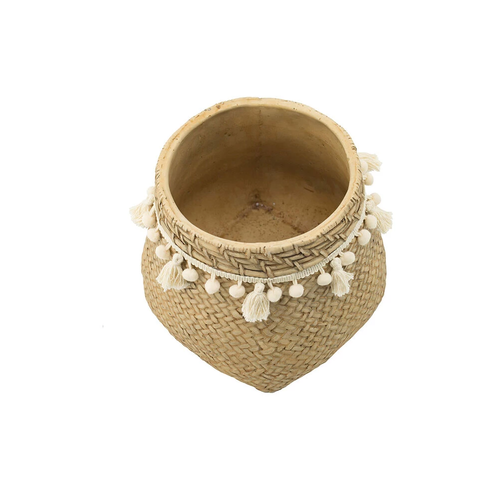 Woven Detail Outdoor Planter with Tassel Trim – 7″ – Natural, Cream Finish