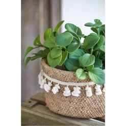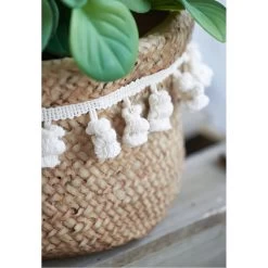 Favorite plants get a naturally playful touch with this set of 2 woven basket planters with mini tassels. The white tassels go all the way around the natural planter for color contrast and a bit of added texture. The different size planters can go on a tabletop, entryway floor and more.Set Products Dimensions: – Large: 12.2″L x 12.2″W x 7.3″H, Small: 7.9″Dia x 4.9″H